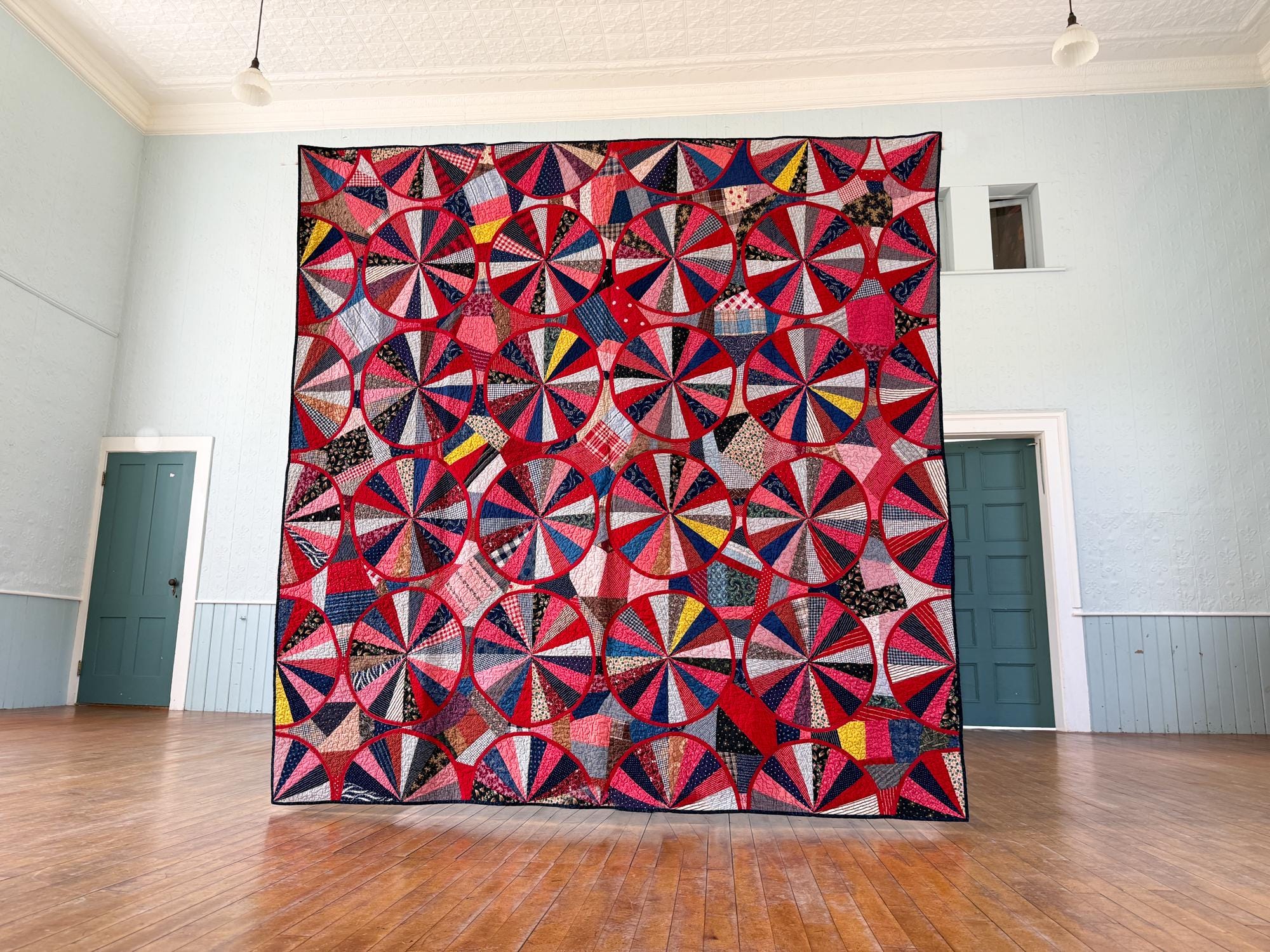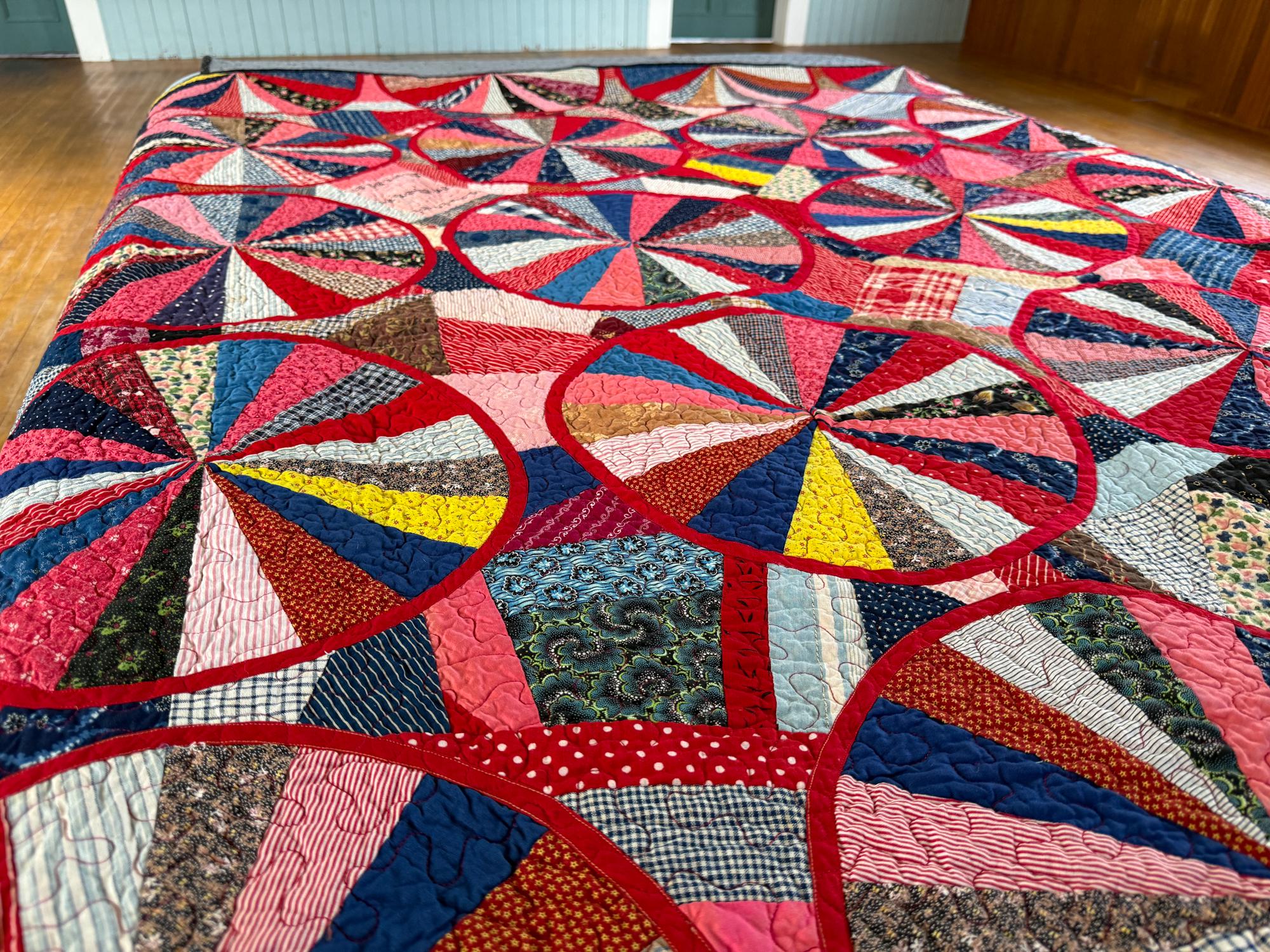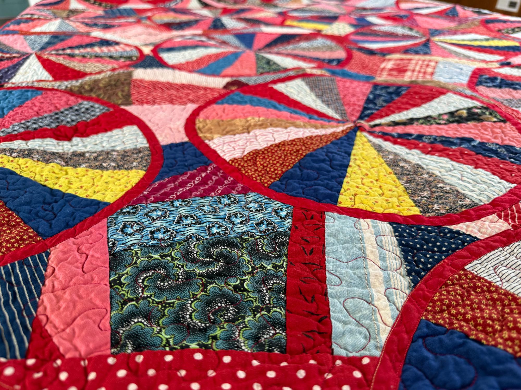 This QUILT! JUST LOOK AT IT! This is a variation on an Endless Chain (the circles) and a Crazy Quilt (the areas between the circles), and I've never seen anything like it. You will find over 900 pieces throughout of various vintage shirting and calicos and other really beautiful, well preserved cottons. Made from a Vintage quilt top that needed some work, which entailed making the red bias tape for all the circles and sewing them on. The original maker had machine sewn bias tape around all the half circles on the edge of the quilt with a sewing machine so I followed suit with the full circles in the center. I have had the quilt top since September of 2020, so early on in the pandemic and I have been working on it since, very slowly and finally it is ready for its debut! I paid a pretty penny for the top, so given the work involved and my original price it's priced accordingly. You will not be disappointed
