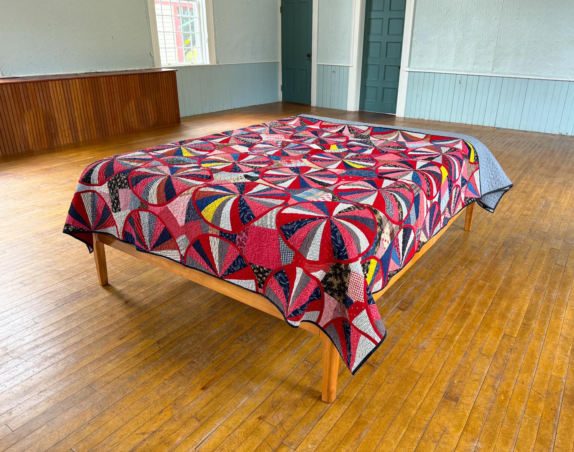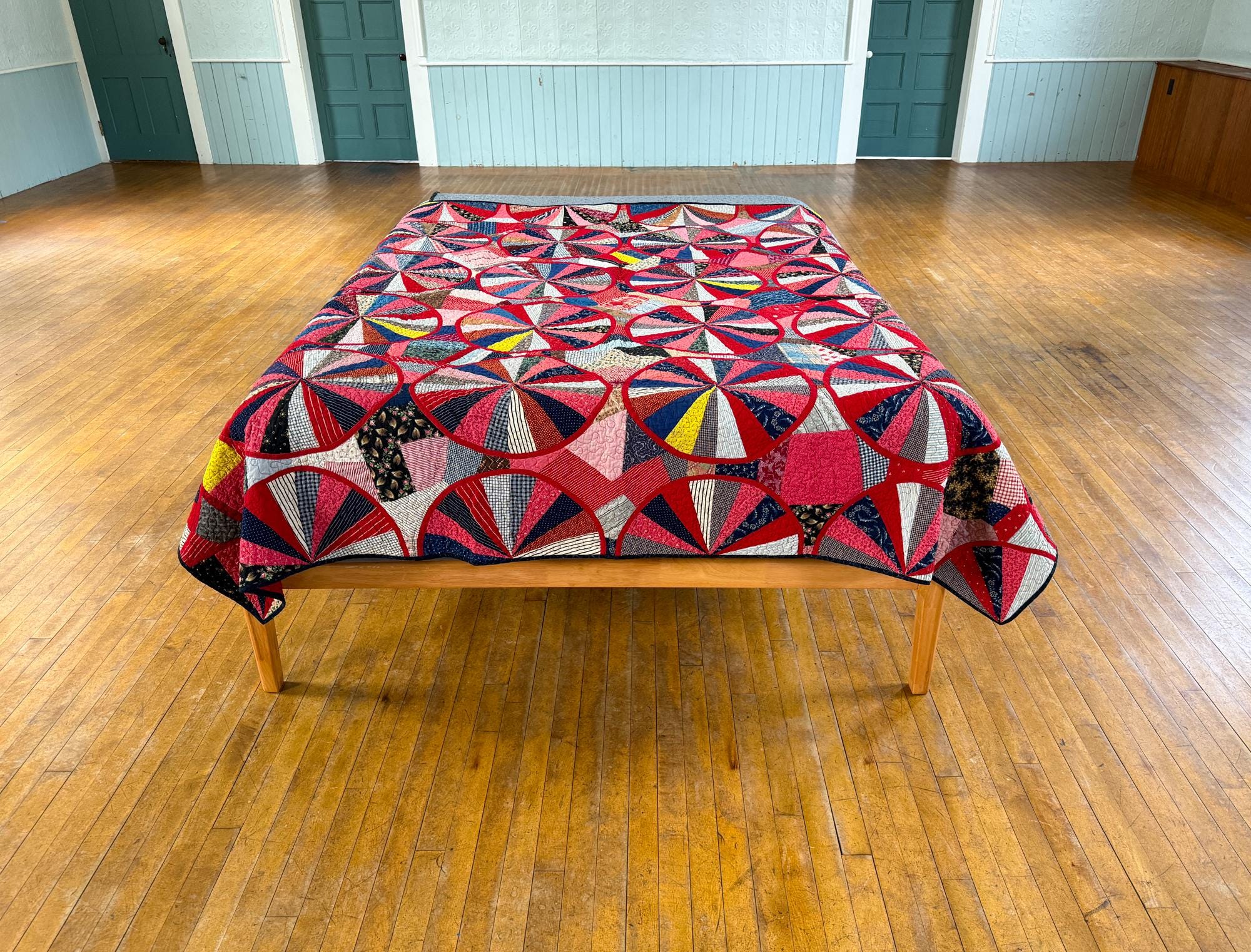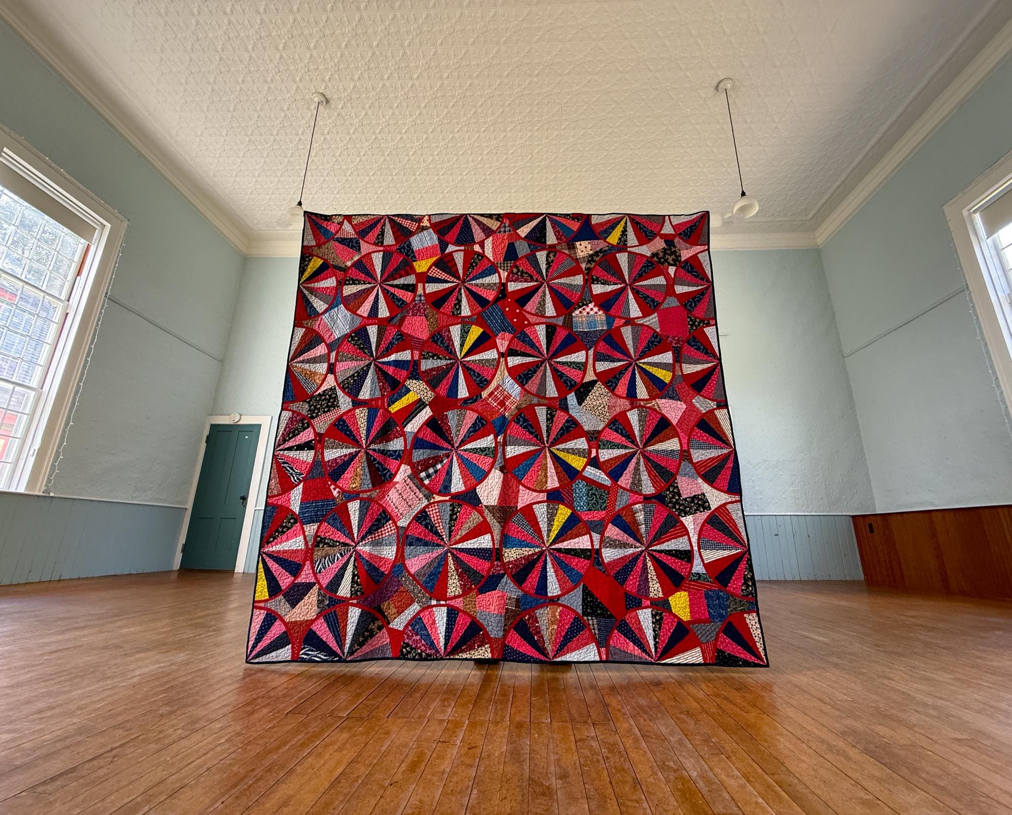 This QUILT! JUST LOOK AT IT! This is a variation on an Endless Chain (the circles) and a Crazy Quilt (the areas between the circles), and I've never seen anything like it. You will find over 900 pieces throughout of various vintage shirting and calicos and other really beautiful, well preserved cottons. Made from a Vintage quilt top that needed some work, which entailed making the red bias tape for all the circles and sewing them on. The original maker had machine sewn bias tape around all the half circles on the edge of the quilt with a sewing machine so I followed suit with the full circles in the center. I have had the quilt top since September of 2020, so early on in the pandemic and I have been working on it since, very slowly and finally it is ready for its debut! I paid a pretty penny for the top, so given the work involved and my original price it's priced accordingly. You will not be disappointed