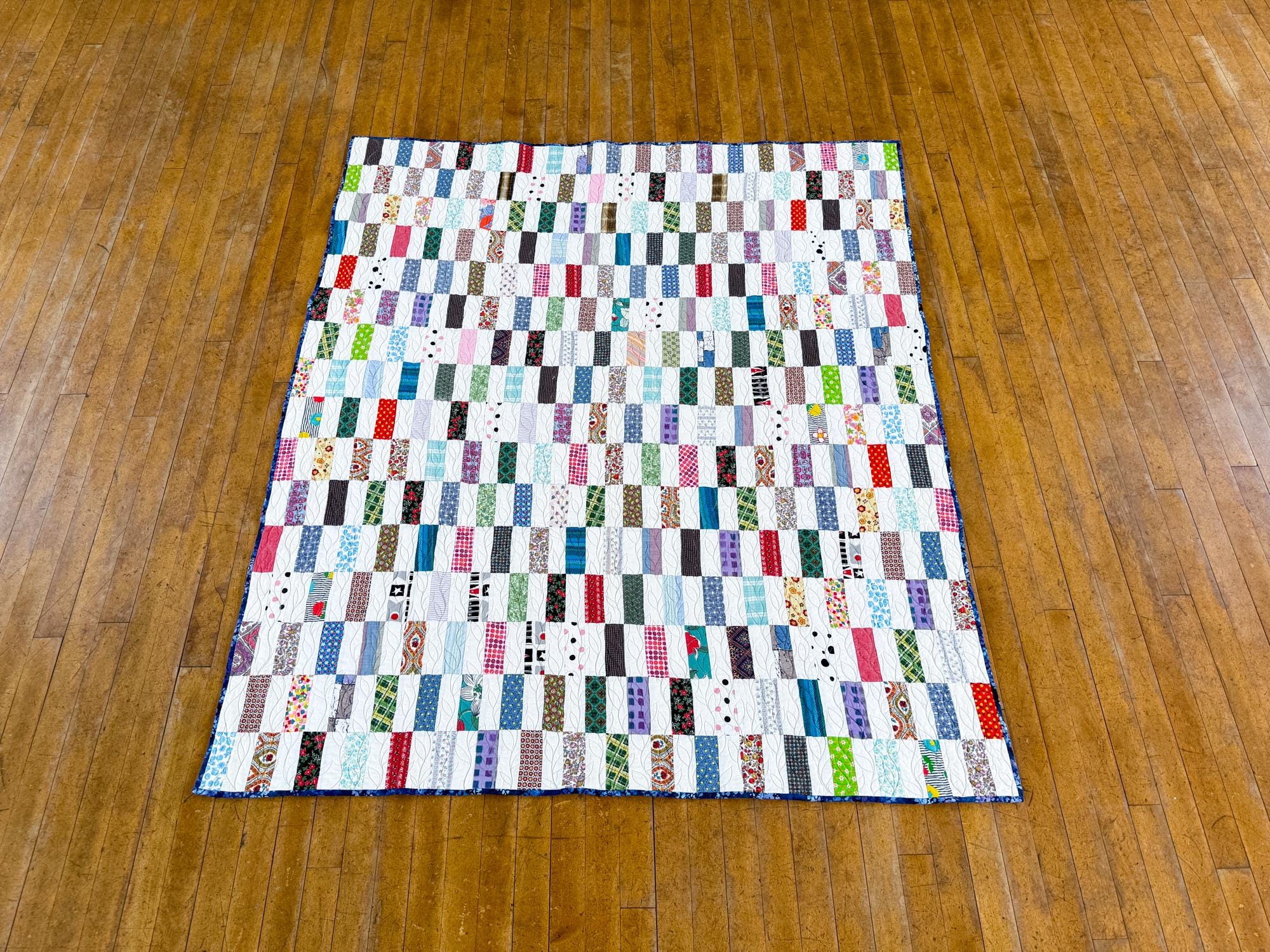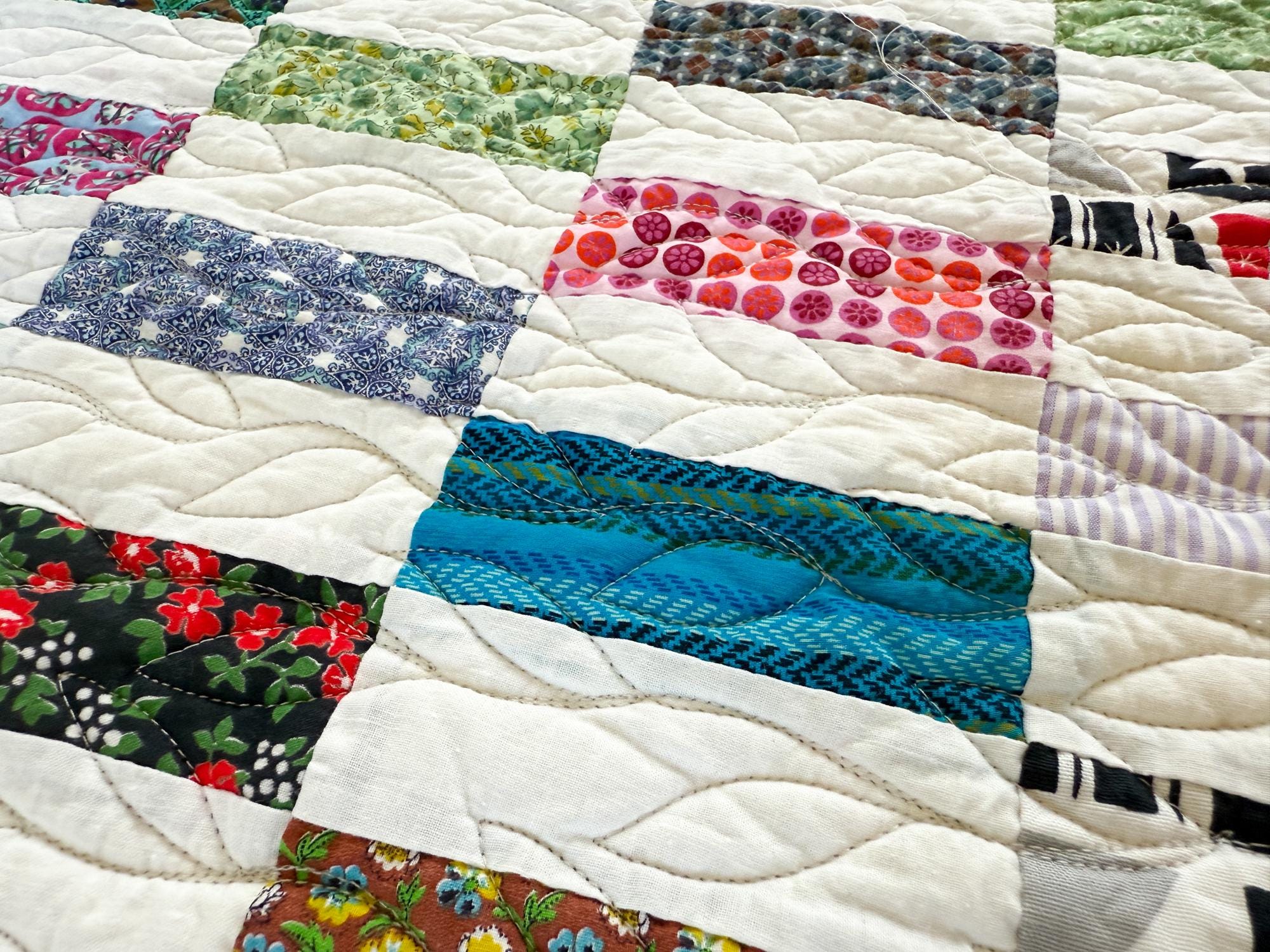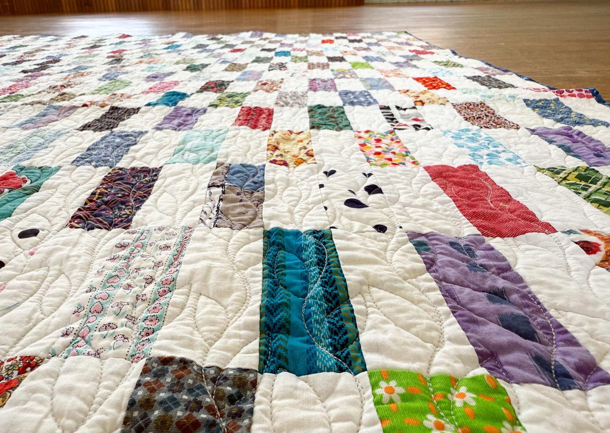 Measuring 55.5 x 63.5 inches, this quilt is the perfect size for a cozy throw on the couch, a vibrant bed accent, or a unique wall hanging. The wide range of prints and colors — from cheerful florals to bold geometrics — gives this quilt a lively, scrappy charm that will brighten any space.