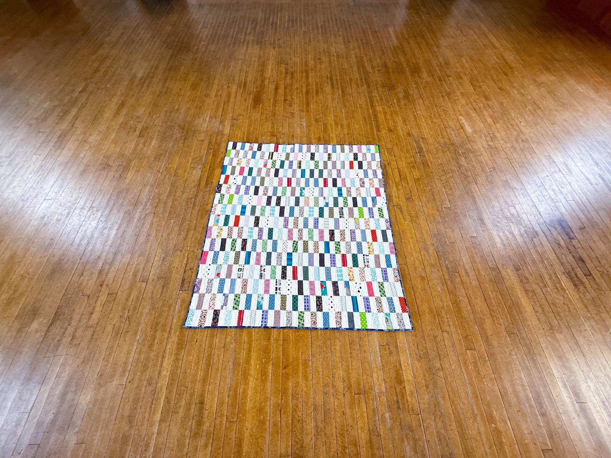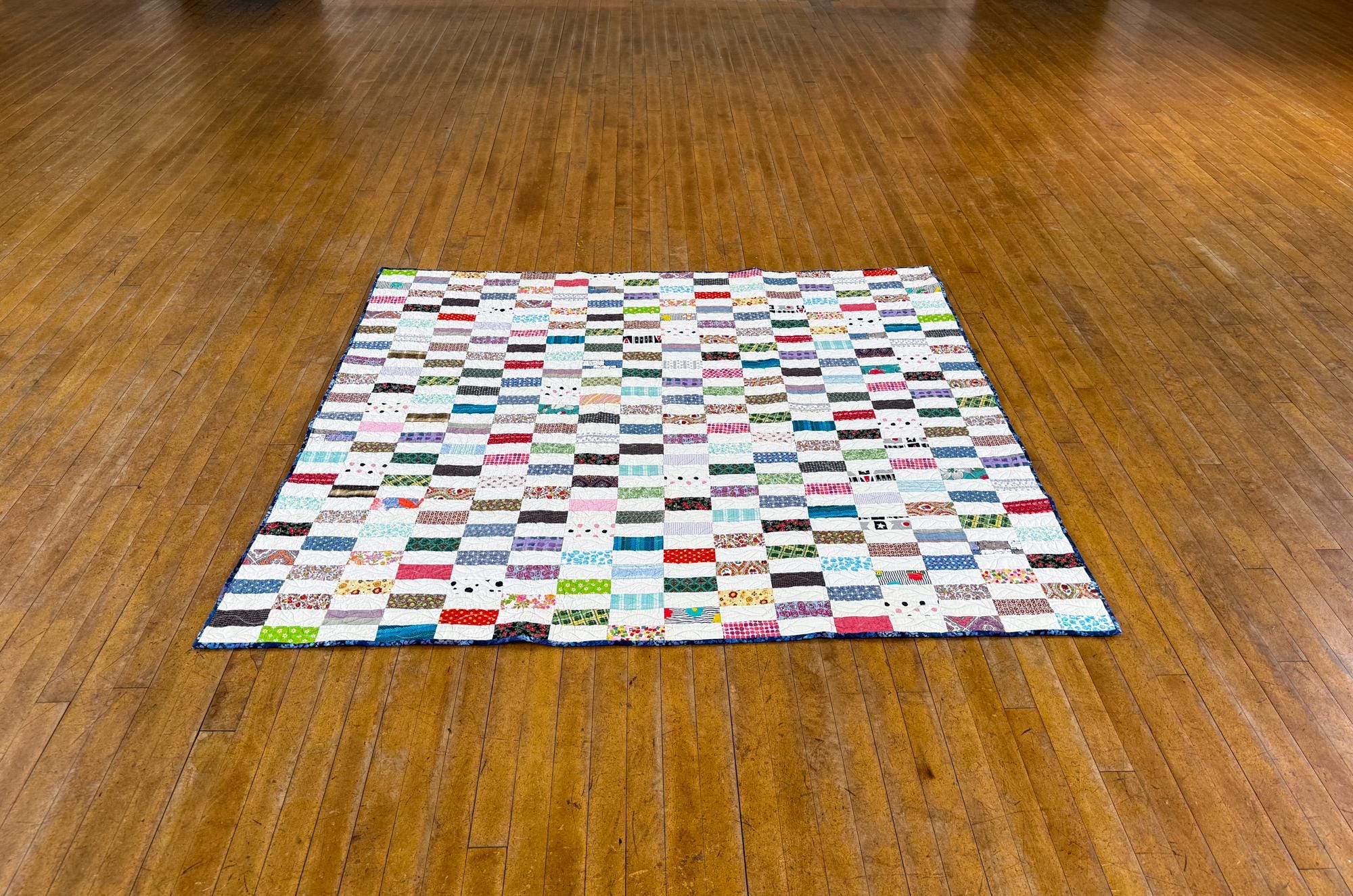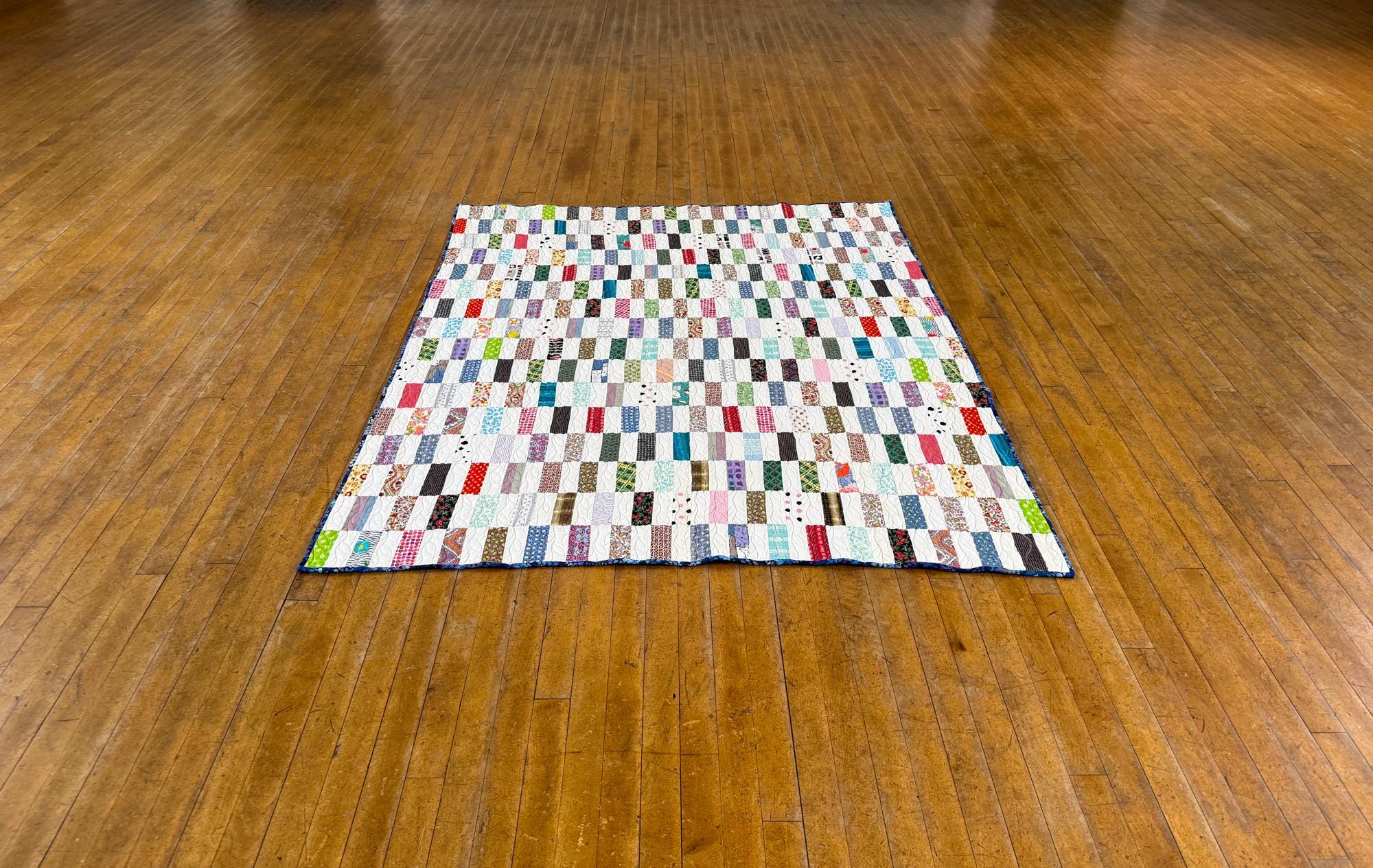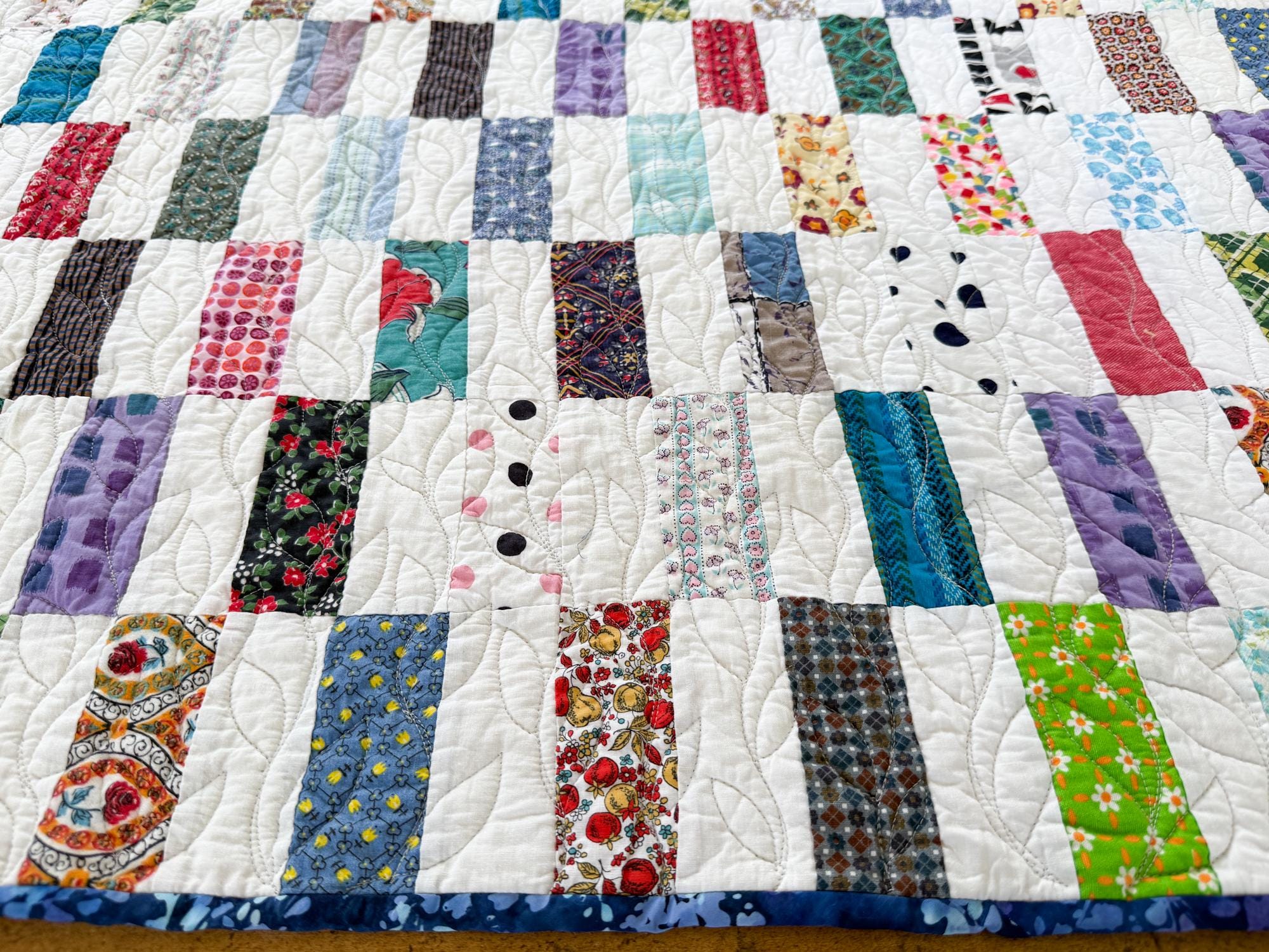 Measuring 55.5 x 63.5 inches, this quilt is the perfect size for a cozy throw on the couch, a vibrant bed accent, or a unique wall hanging. The wide range of prints and colors — from cheerful florals to bold geometrics — gives this quilt a lively, scrappy charm that will brighten any space.