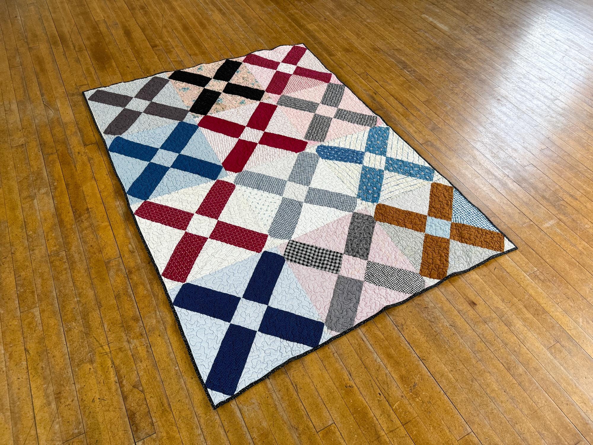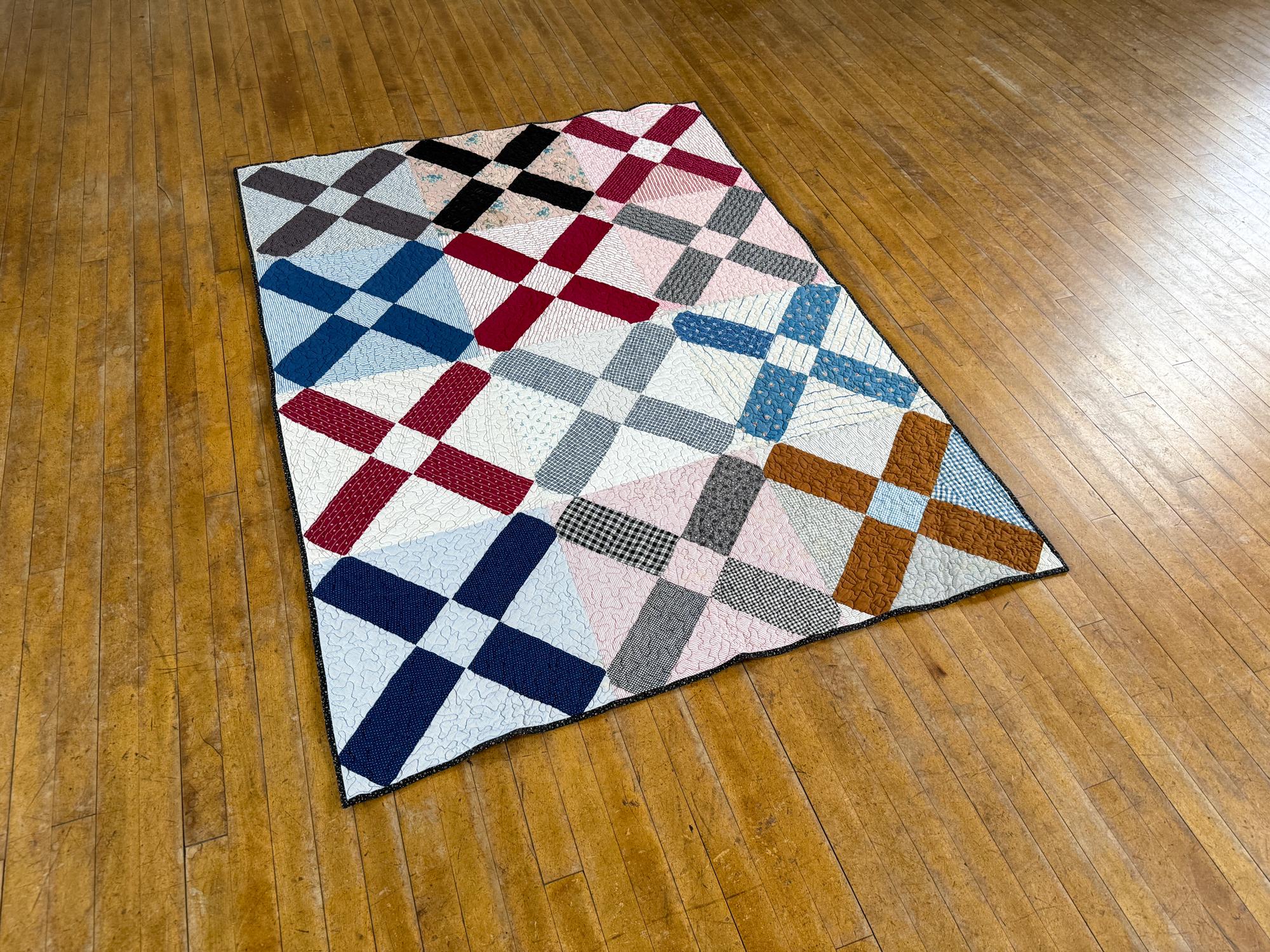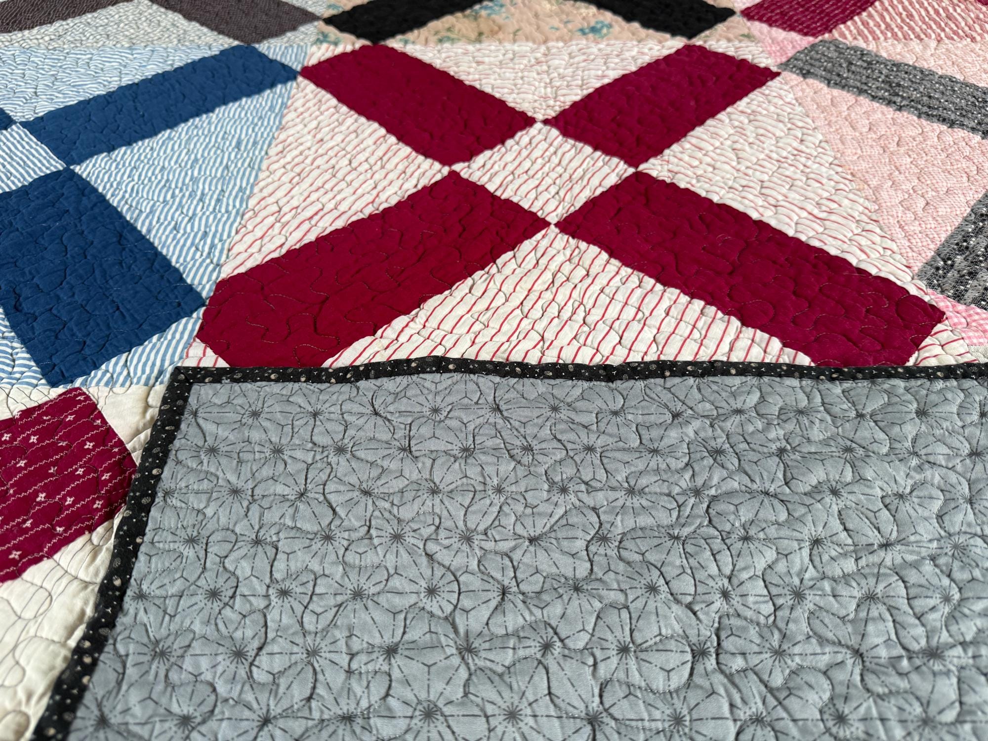 The quilt is composed of 12 original hand-pieced blocks, which I purchased as a set and then carefully arranged to create a pleasing balance of color, contrast, and design. The result is a visually striking layout that feels both classic and timeless.