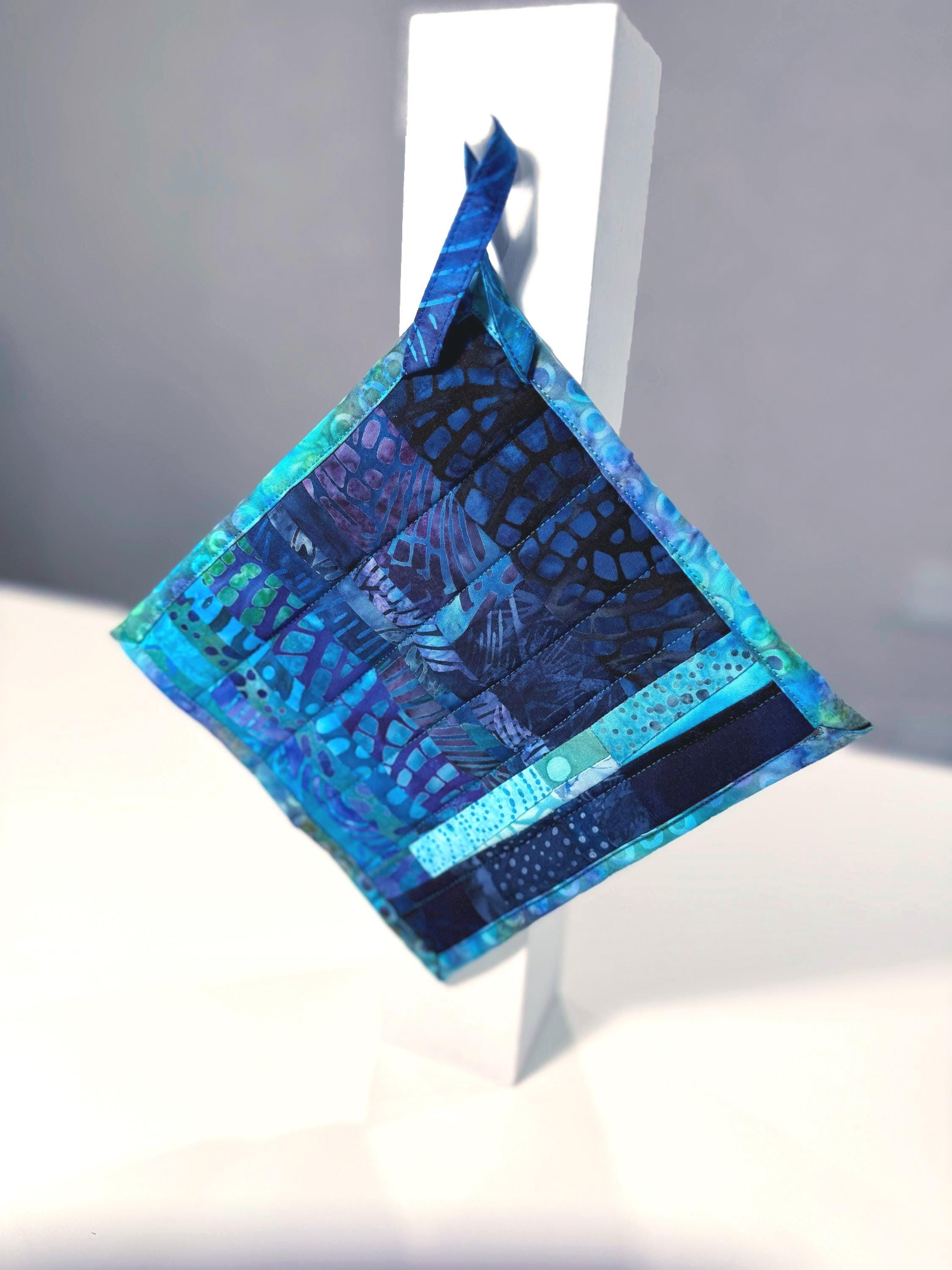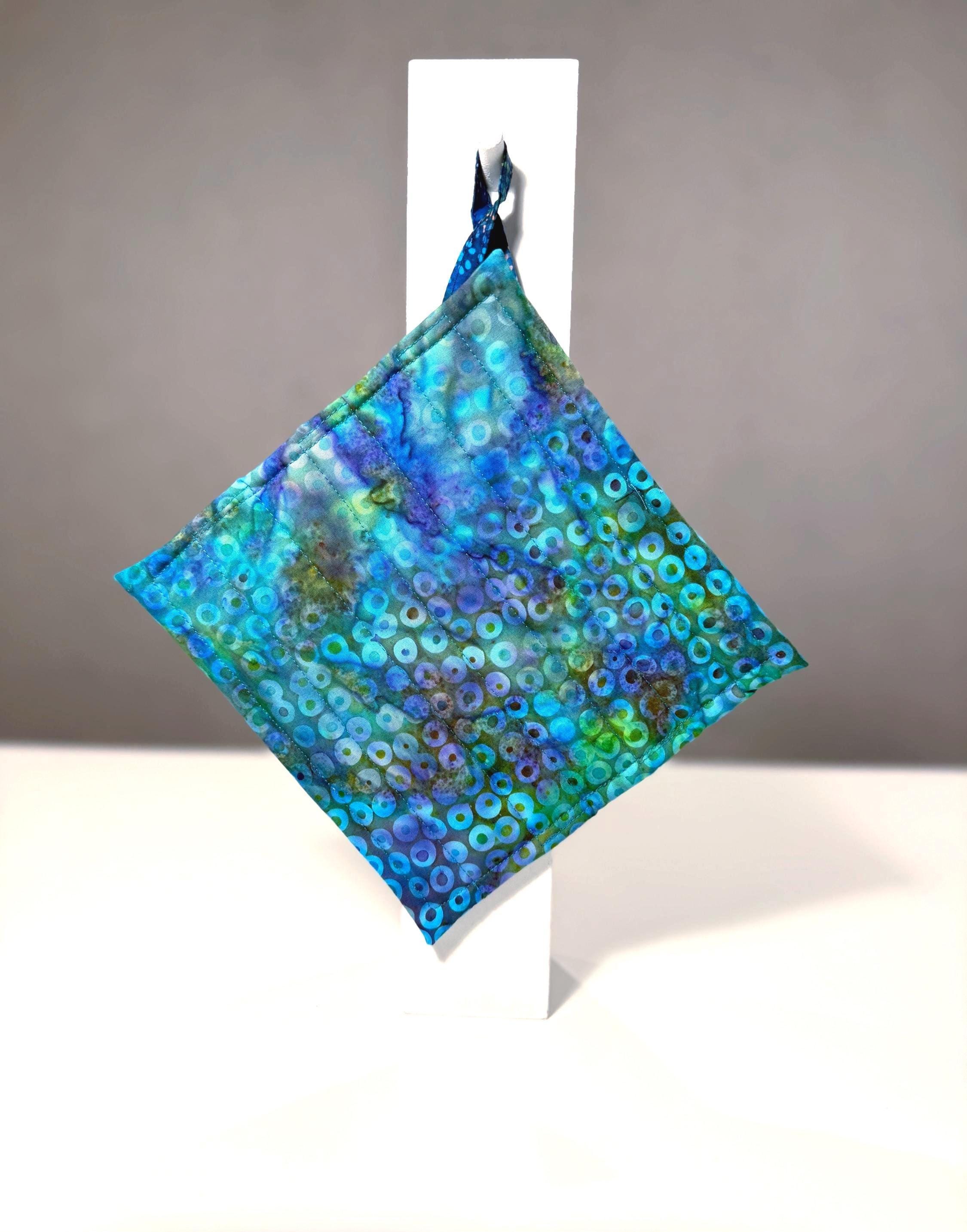 Handmade Quilted Pot holder in turquoise blues and greens, just like the ocean!