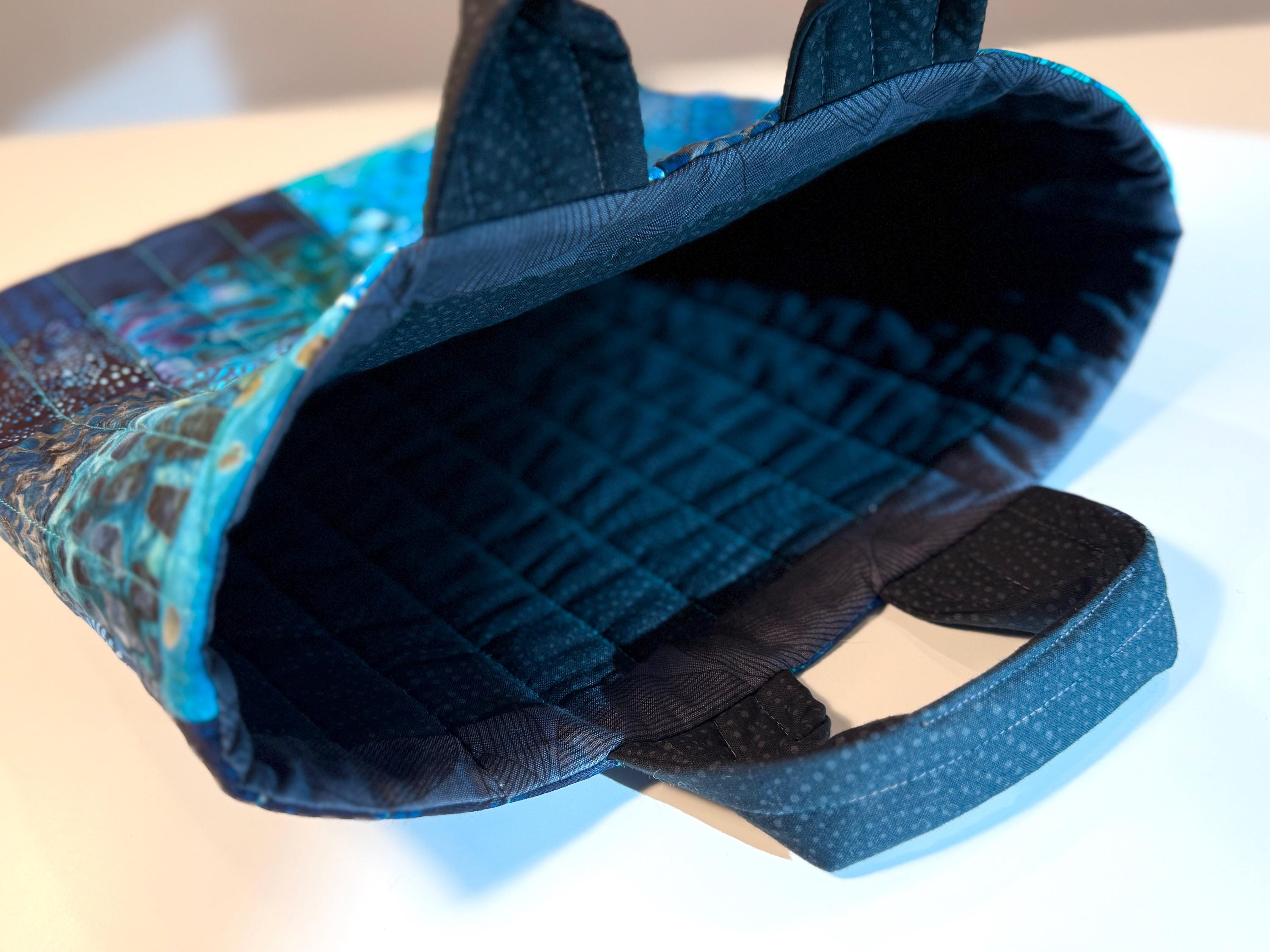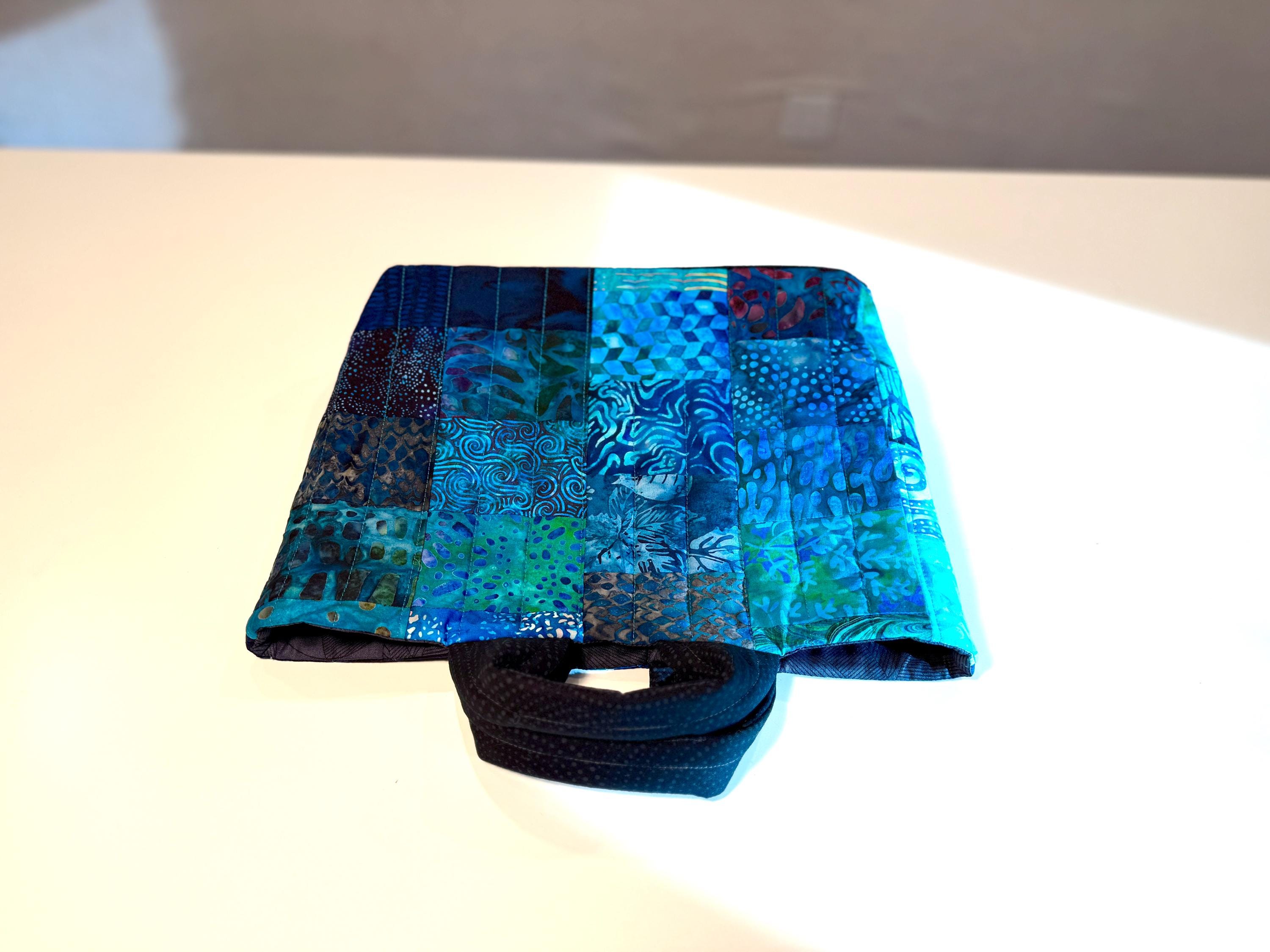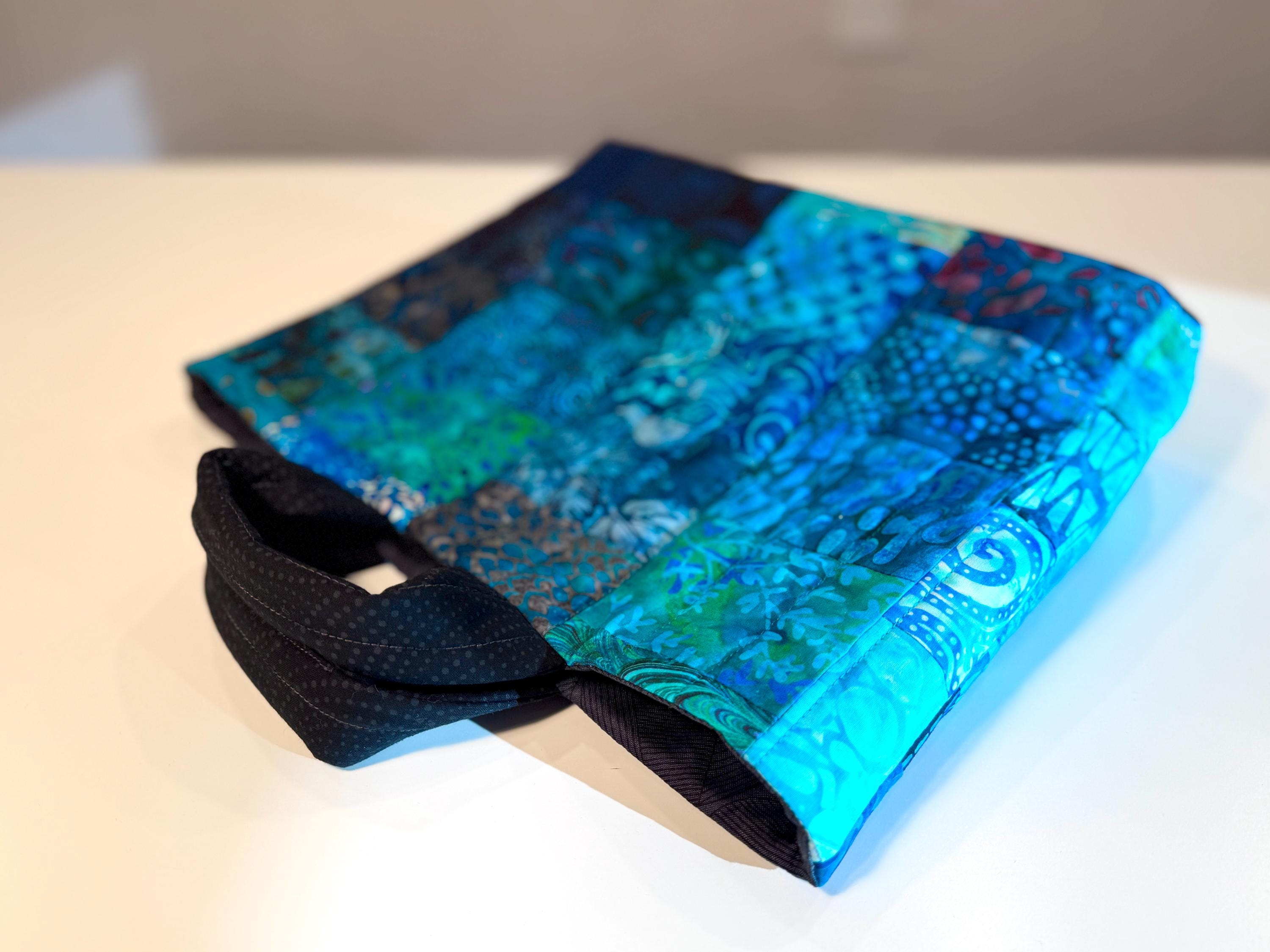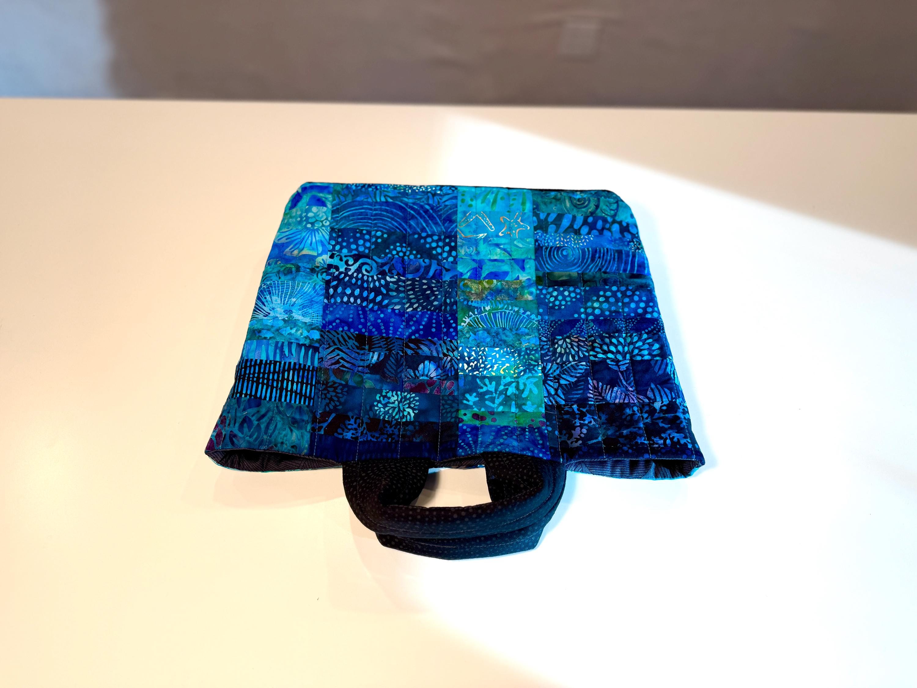 Dive into a wave of color with this one-of-a-kind quilted bag crafted from the leftover cuttings from my Oceanic Dream quilt series. Every tiny scrap is given new life—nothing goes to waste—making this tote an eco-friendly celebration of creativity and sustainability. This particular bag features 70 patchwork fabric pieces, all in rich ocean-inspired blues and teals that flow together like a watercolor tide.