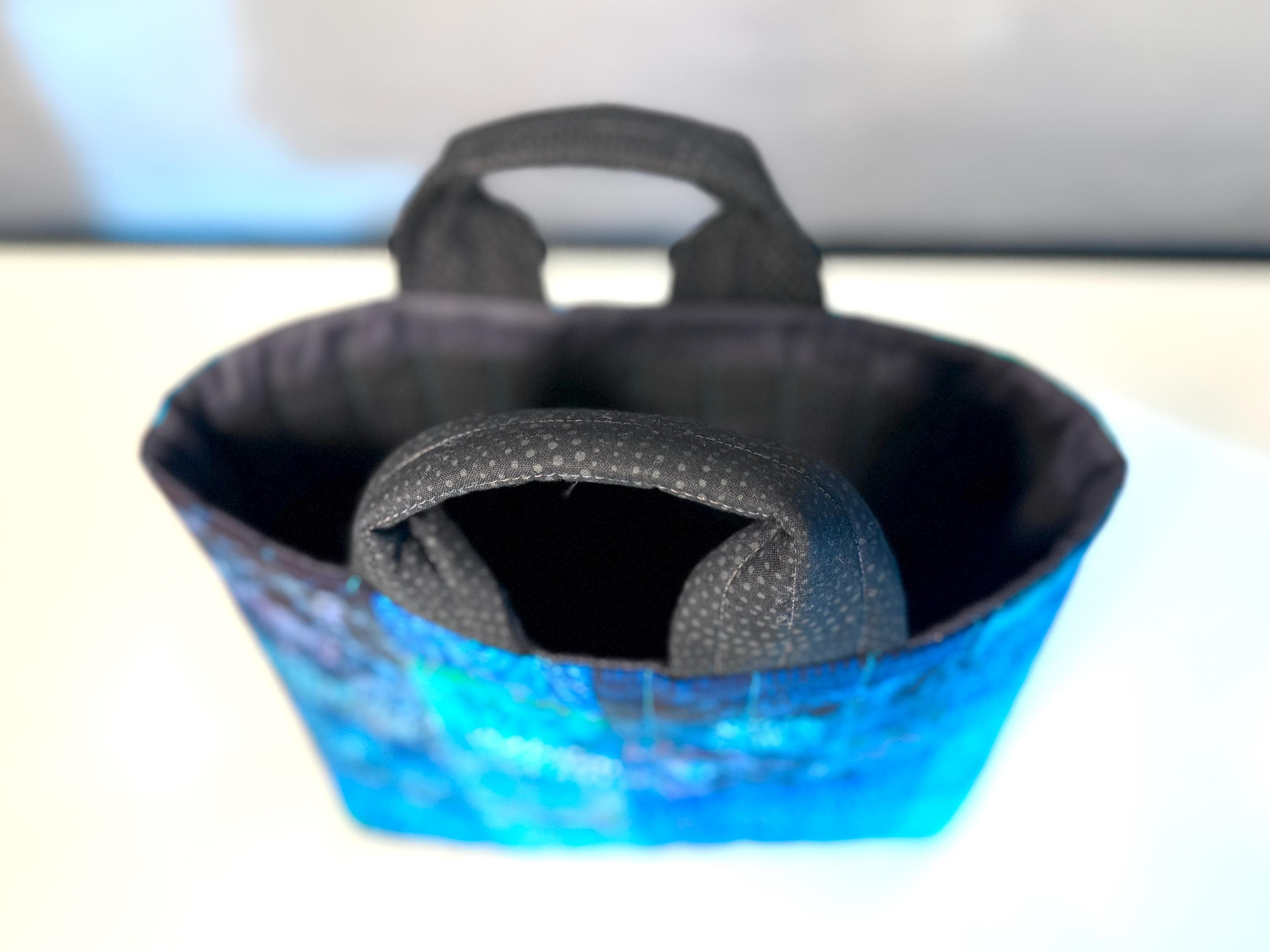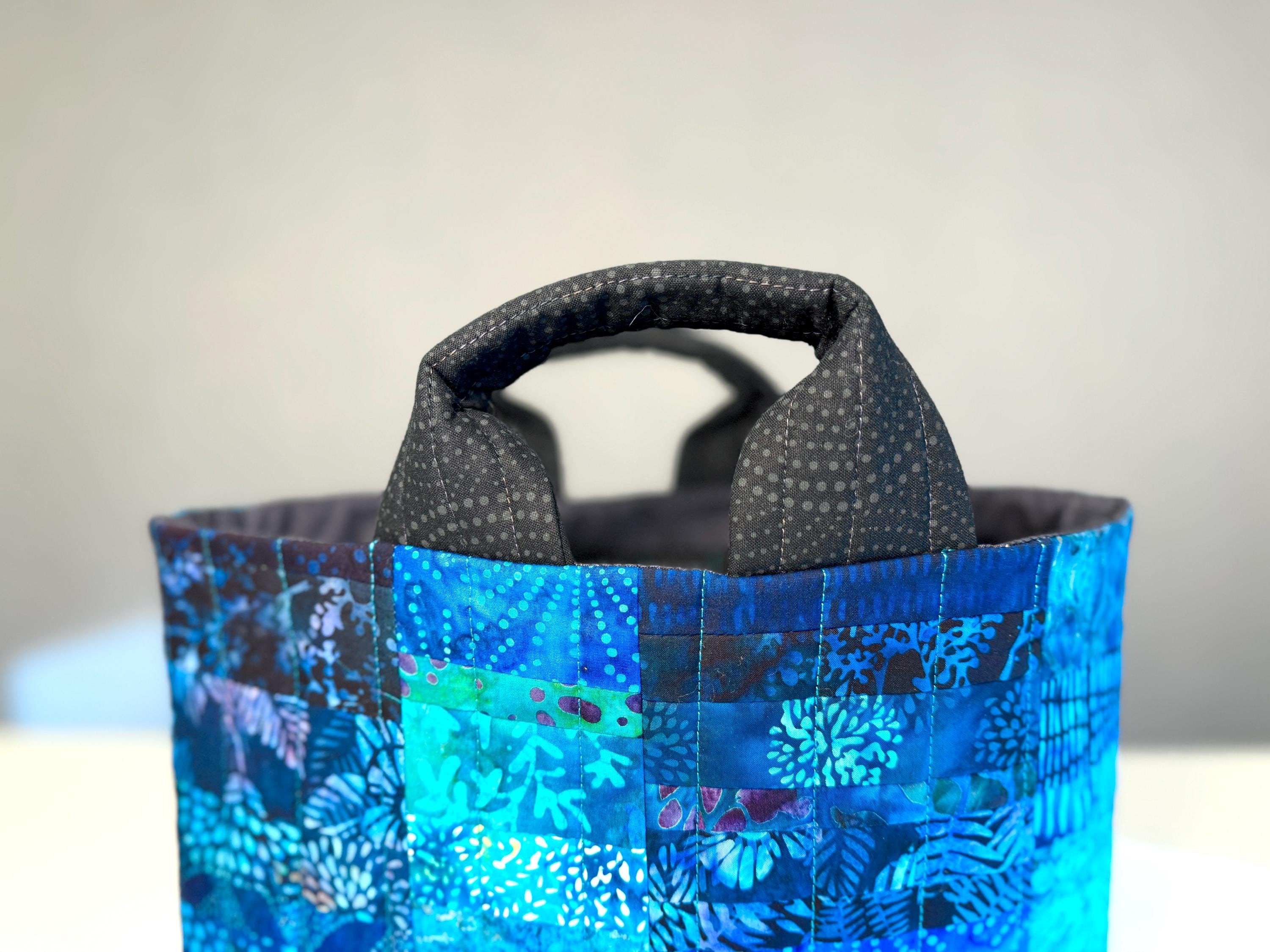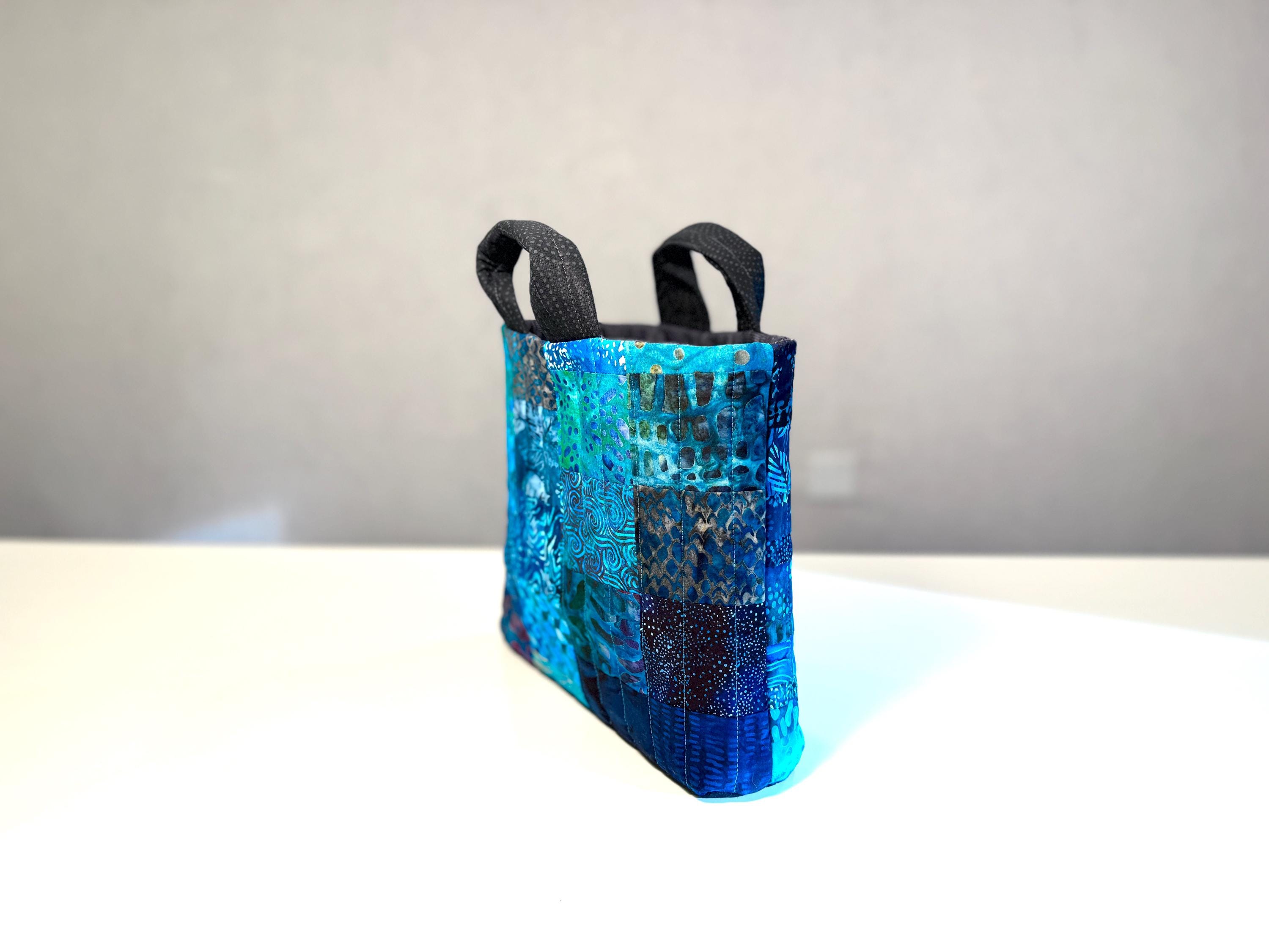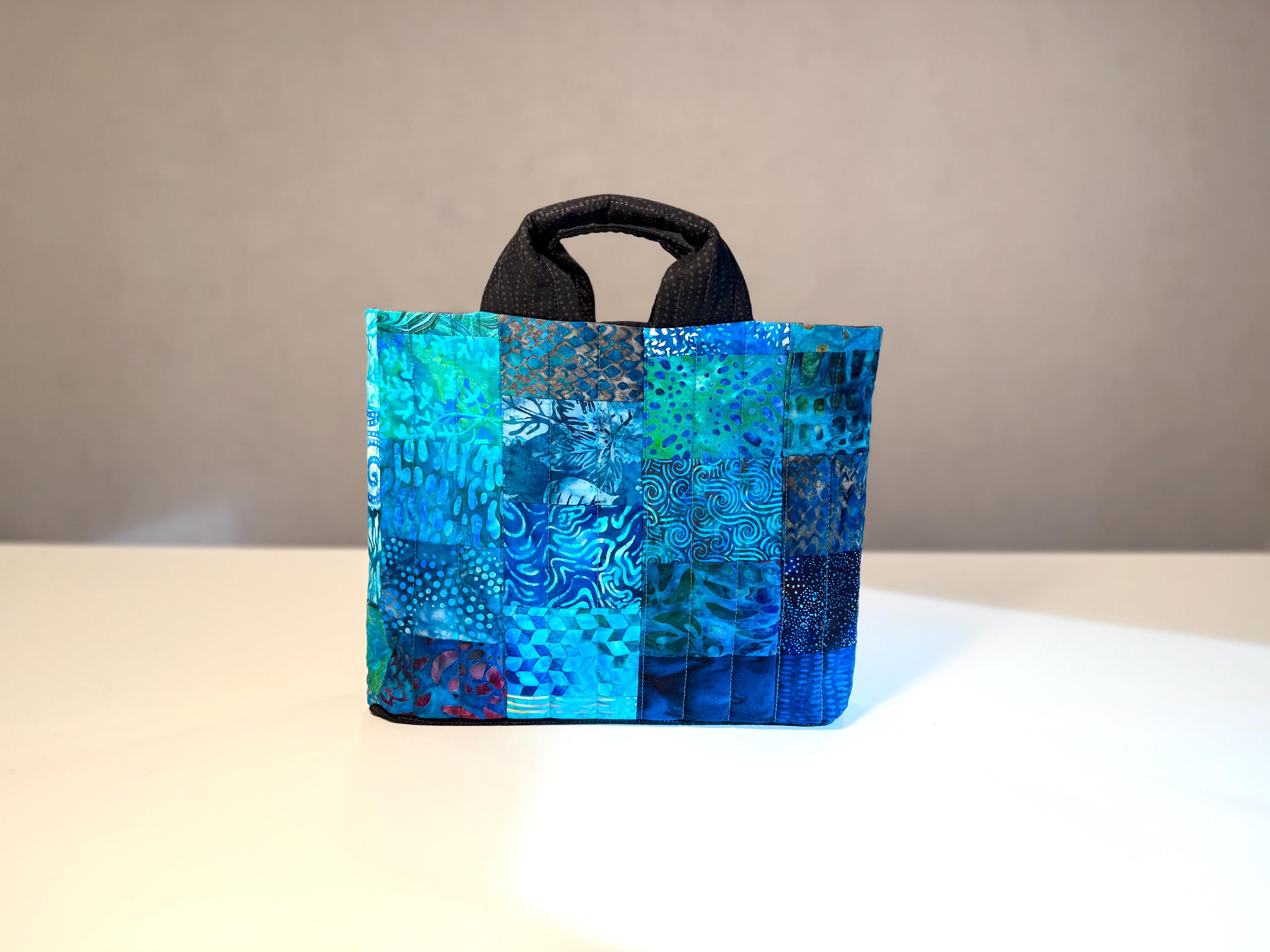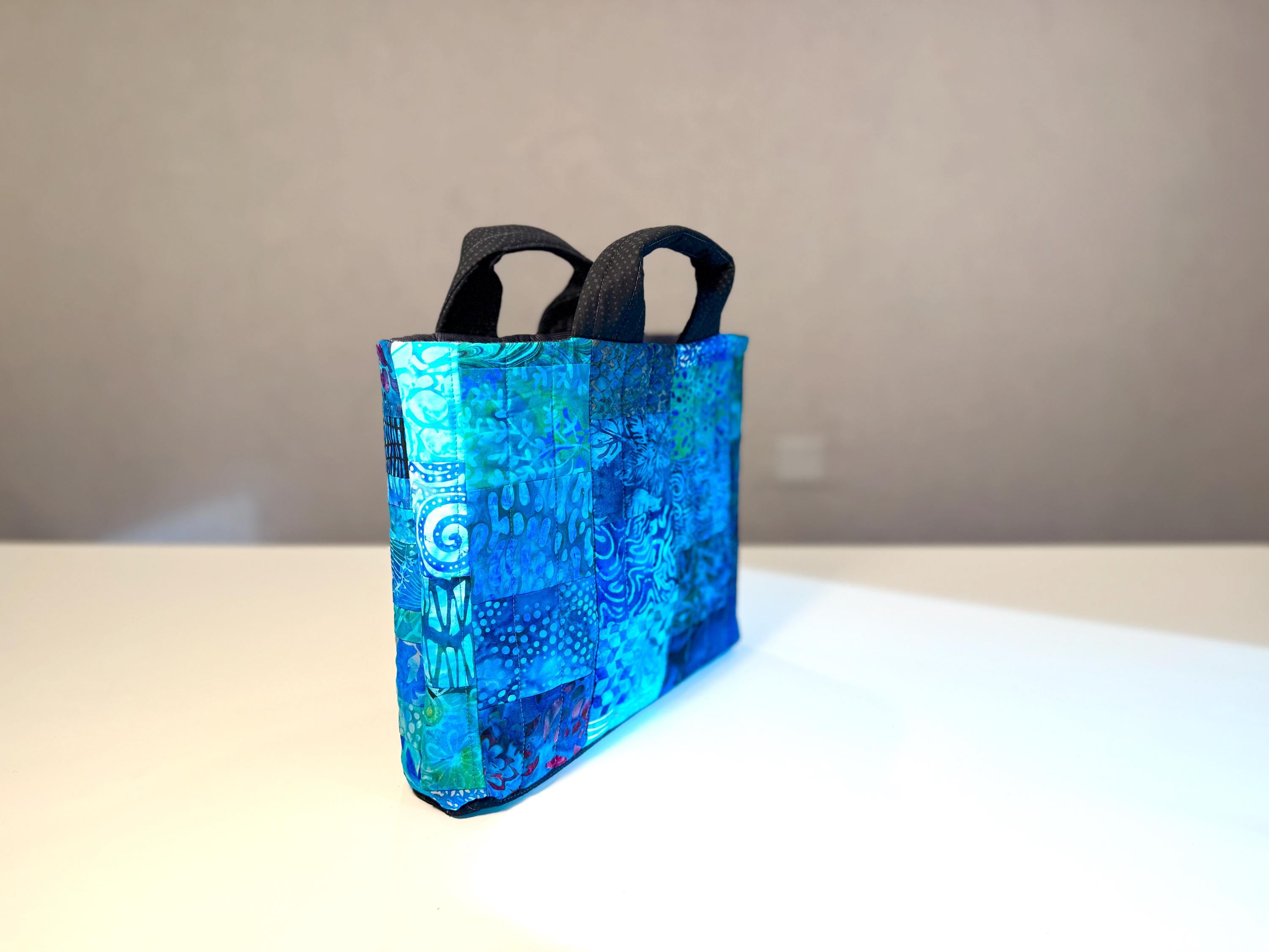 Dive into a wave of color with this one-of-a-kind quilted bag crafted from the leftover cuttings from my Oceanic Dream quilt series. Every tiny scrap is given new life—nothing goes to waste—making this tote an eco-friendly celebration of creativity and sustainability. This particular bag features 70 patchwork fabric pieces, all in rich ocean-inspired blues and teals that flow together like a watercolor tide.