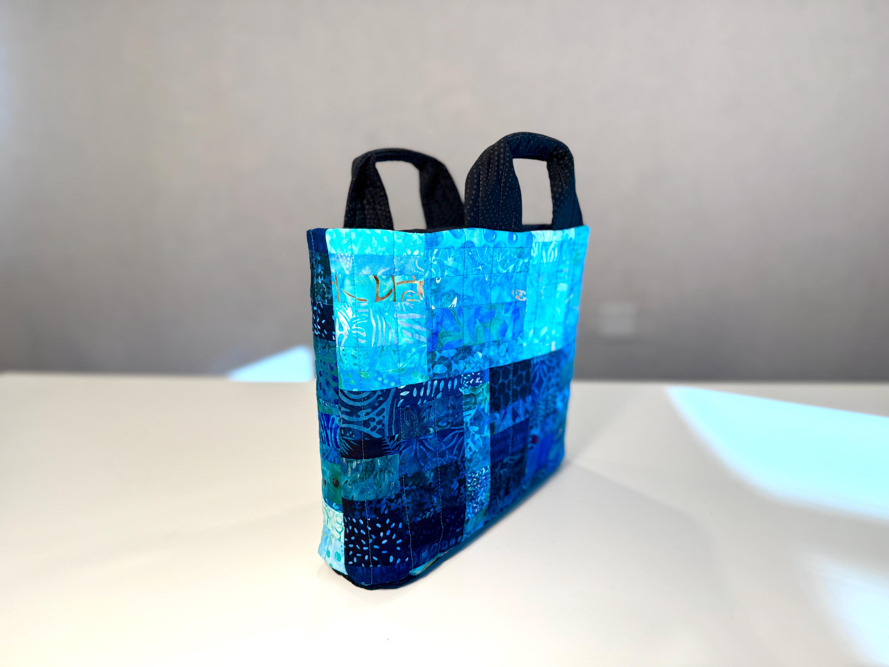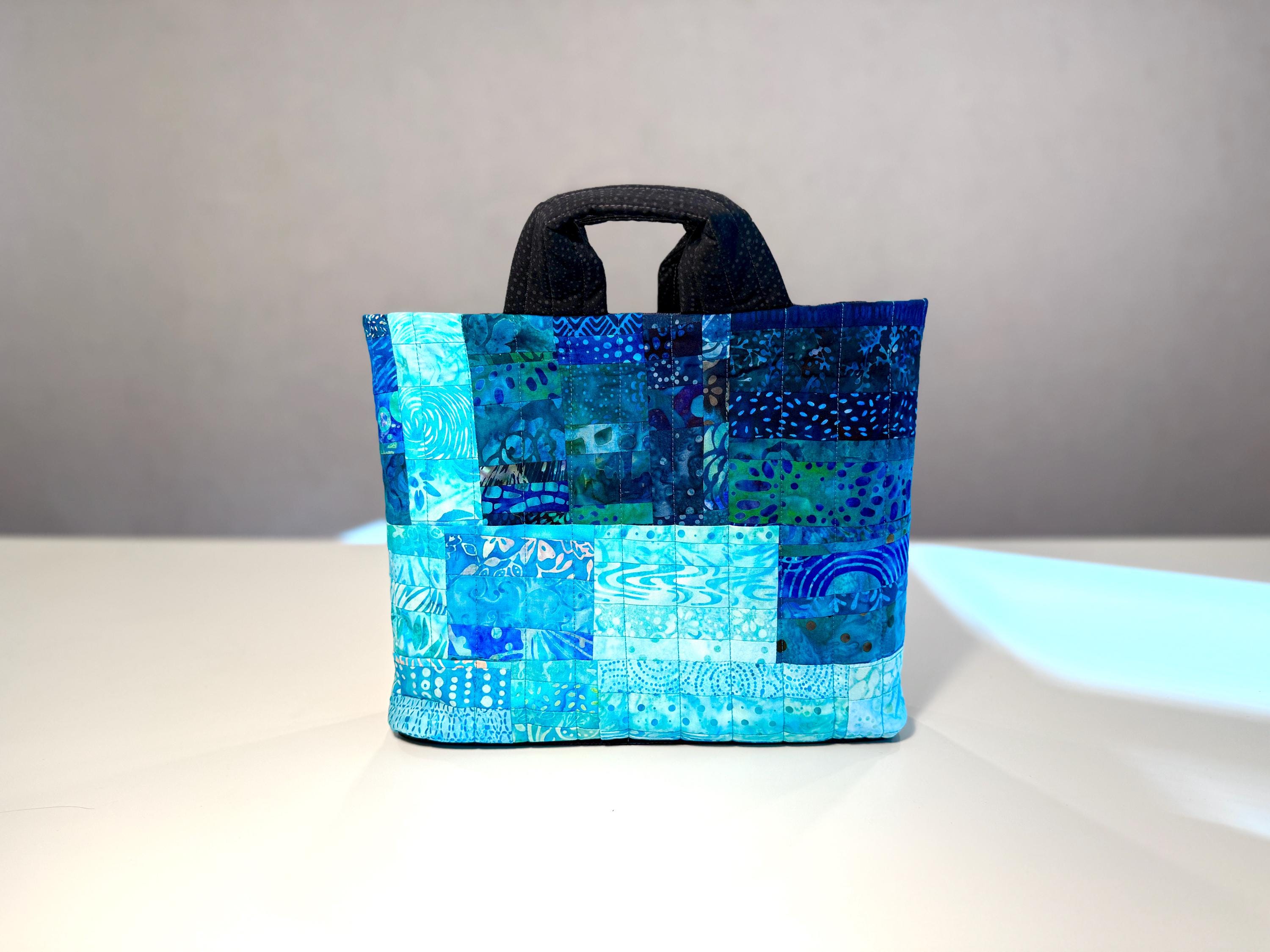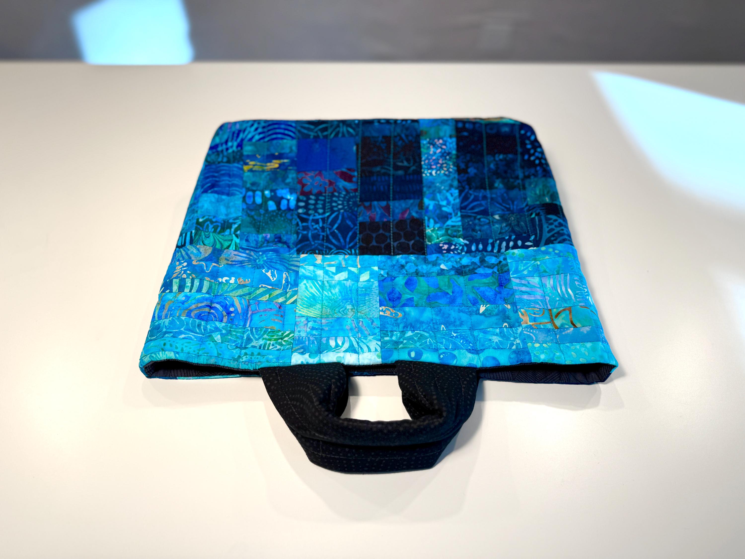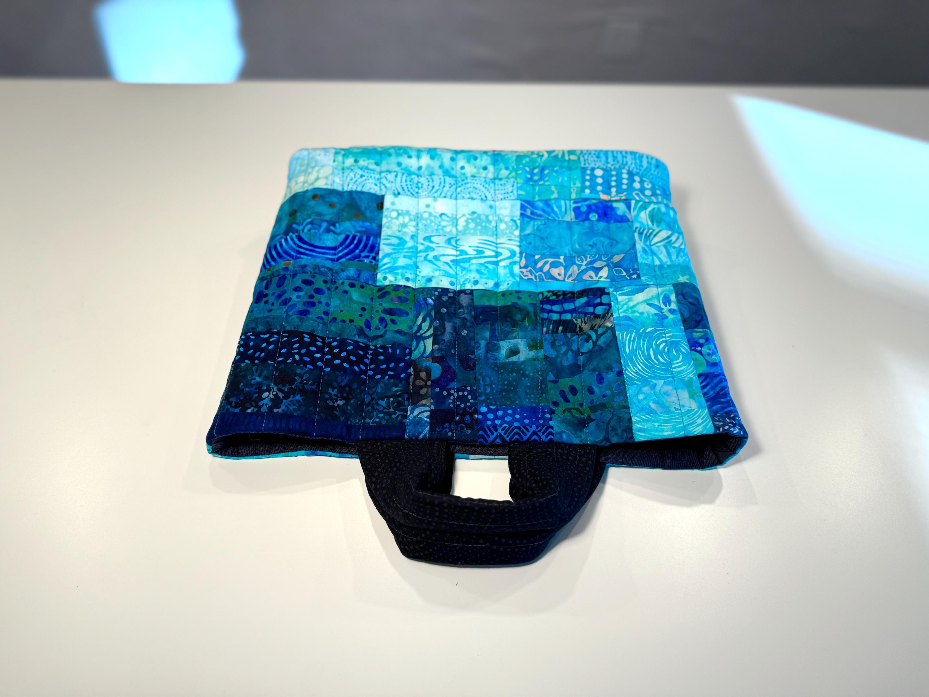 Dive into a wave of color with this one-of-a-kind quilted bag crafted from the leftover cuttings from my Oceanic Dream quilt series. Every tiny scrap is given new life—nothing goes to waste—making this tote an eco-friendly celebration of creativity and sustainability. This particular bag features 160 patchwork fabric pieces, all in rich ocean-inspired blues and teals that flow together like a watercolor tide.
