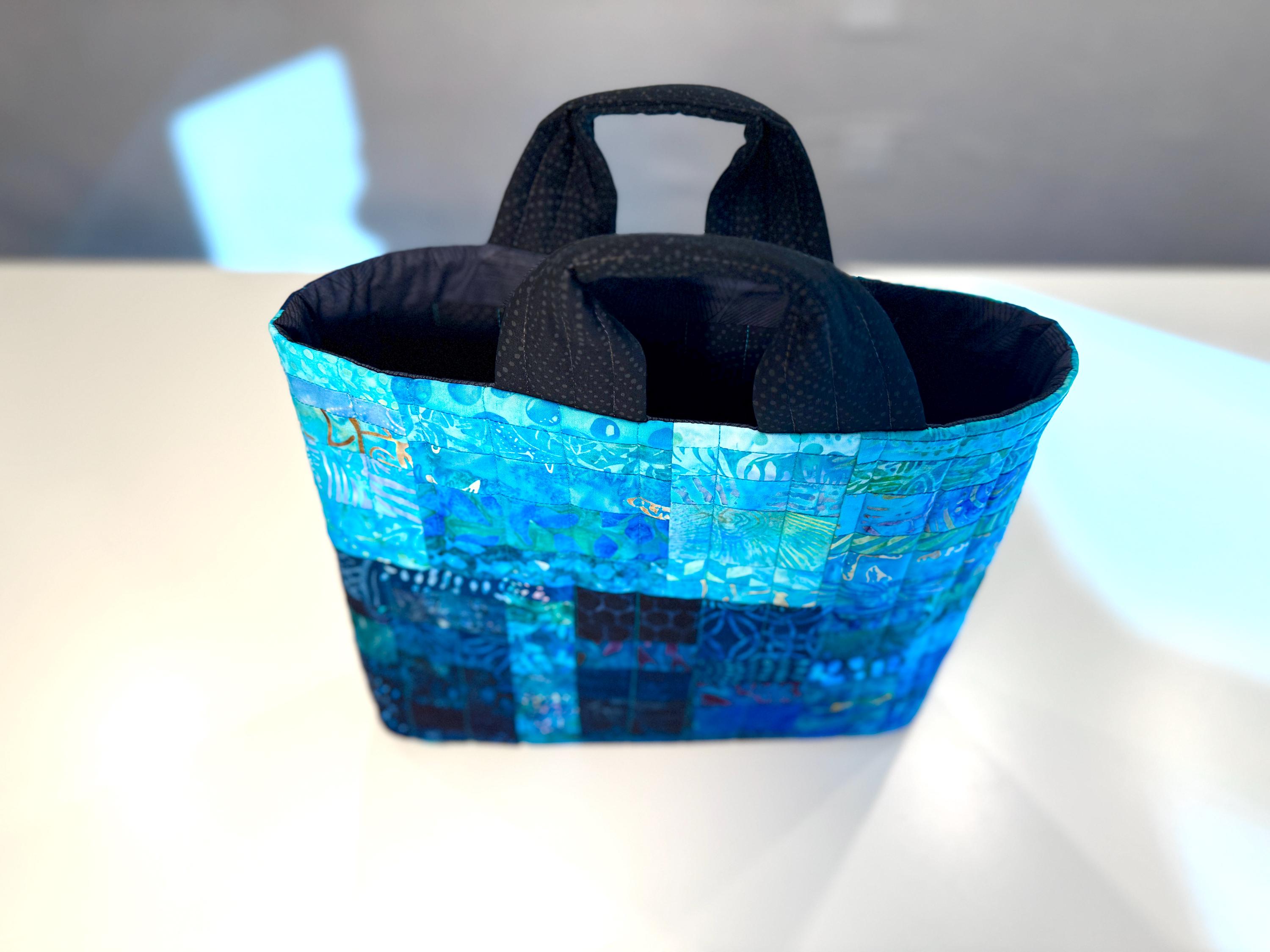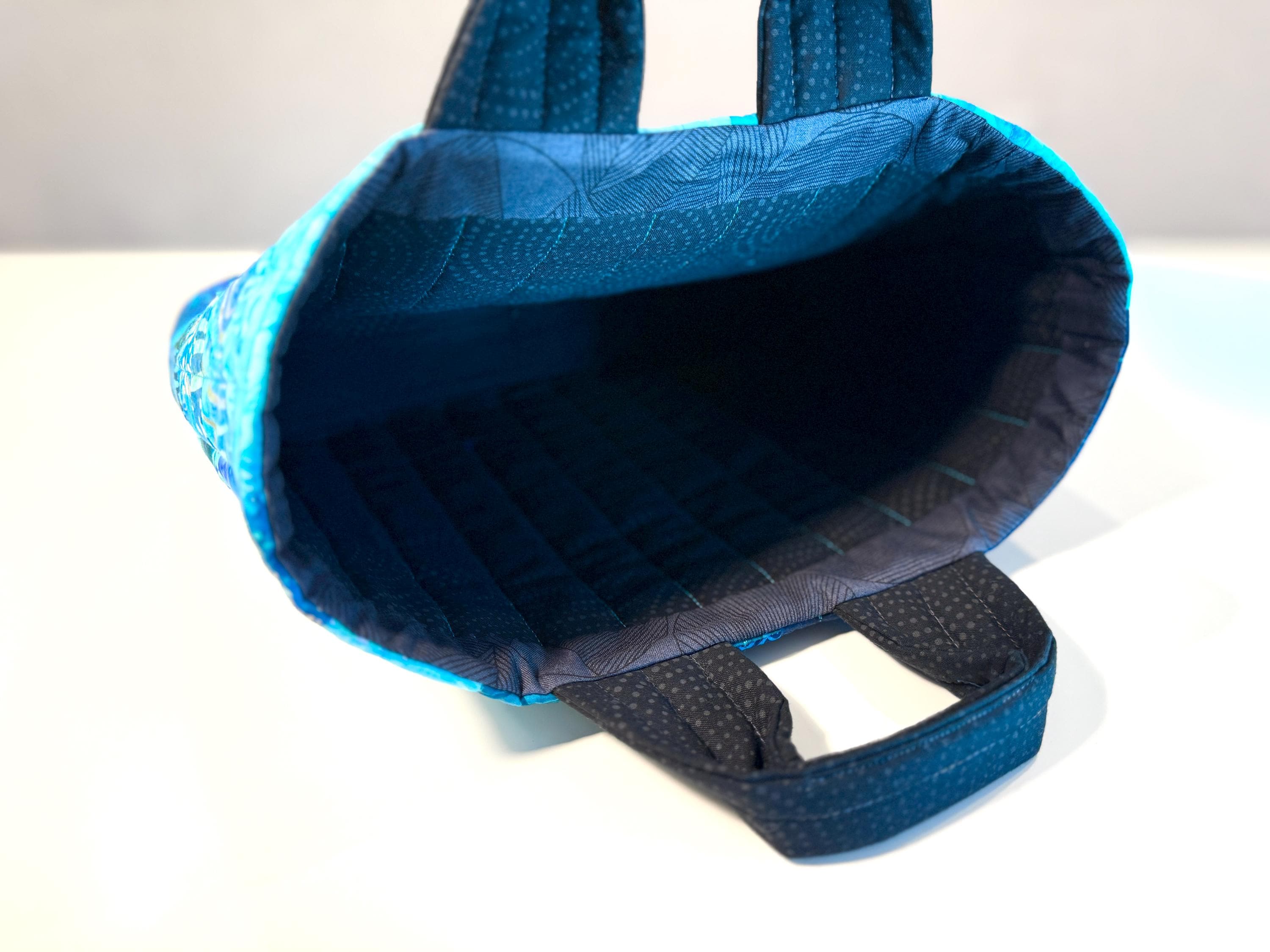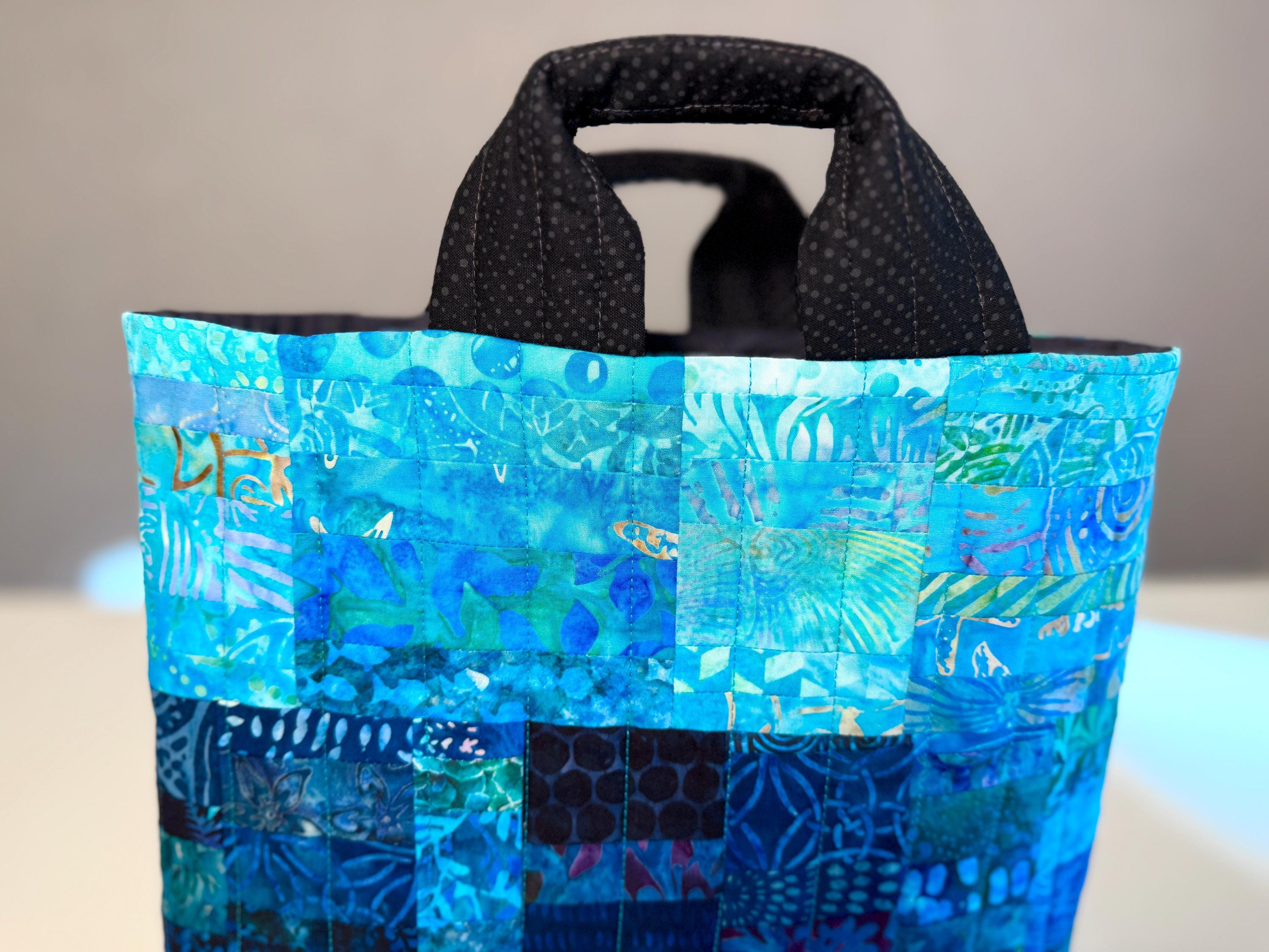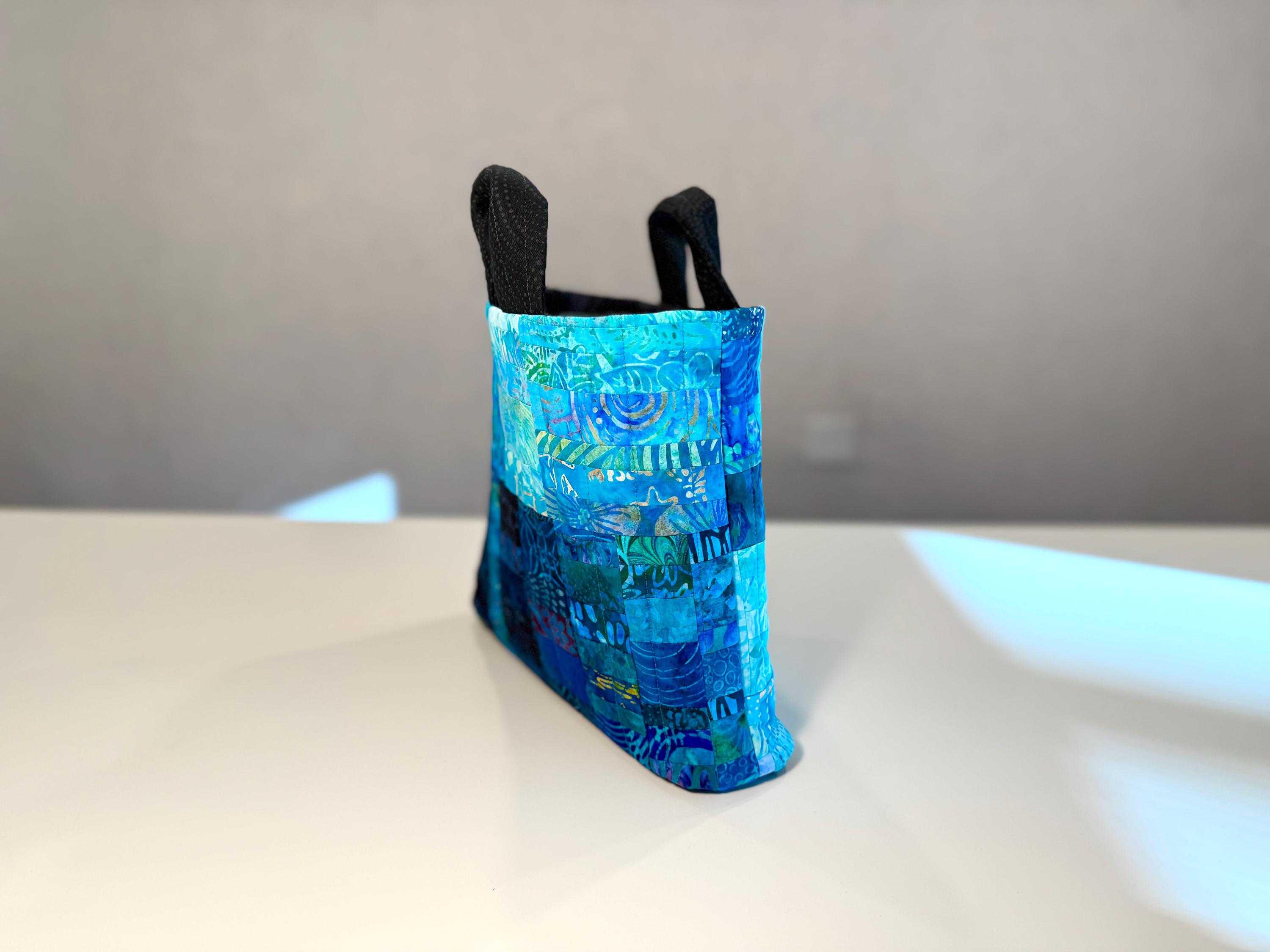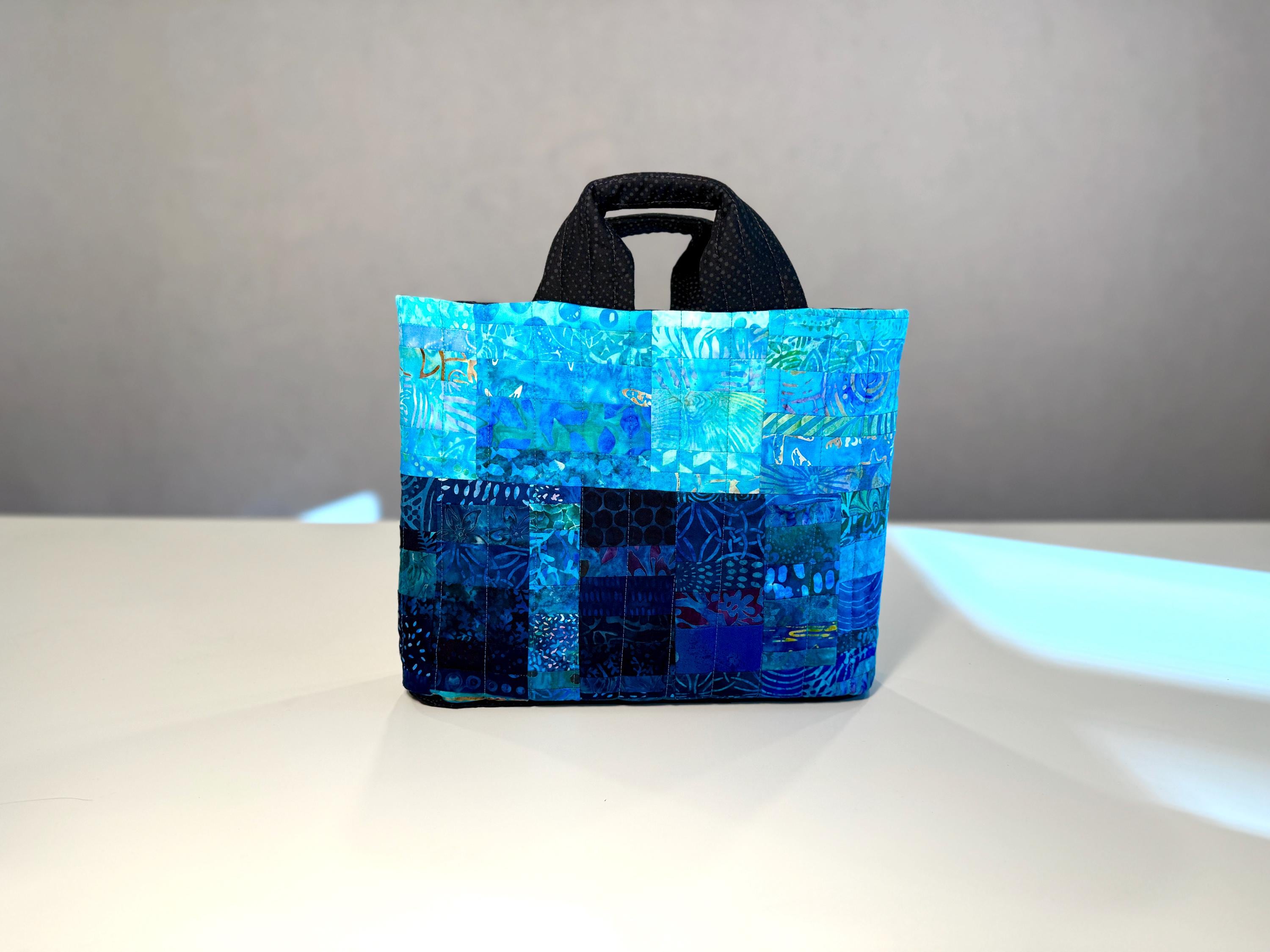 Dive into a wave of color with this one-of-a-kind quilted bag crafted from the leftover cuttings from my Oceanic Dream quilt series. Every tiny scrap is given new life—nothing goes to waste—making this tote an eco-friendly celebration of creativity and sustainability. This particular bag features 160 patchwork fabric pieces, all in rich ocean-inspired blues and teals that flow together like a watercolor tide.