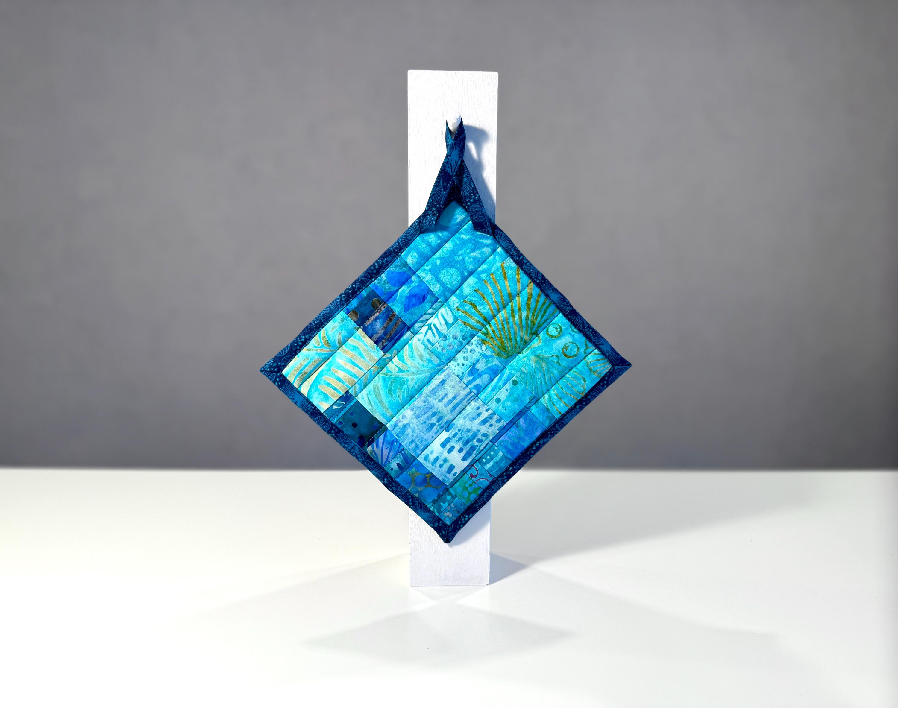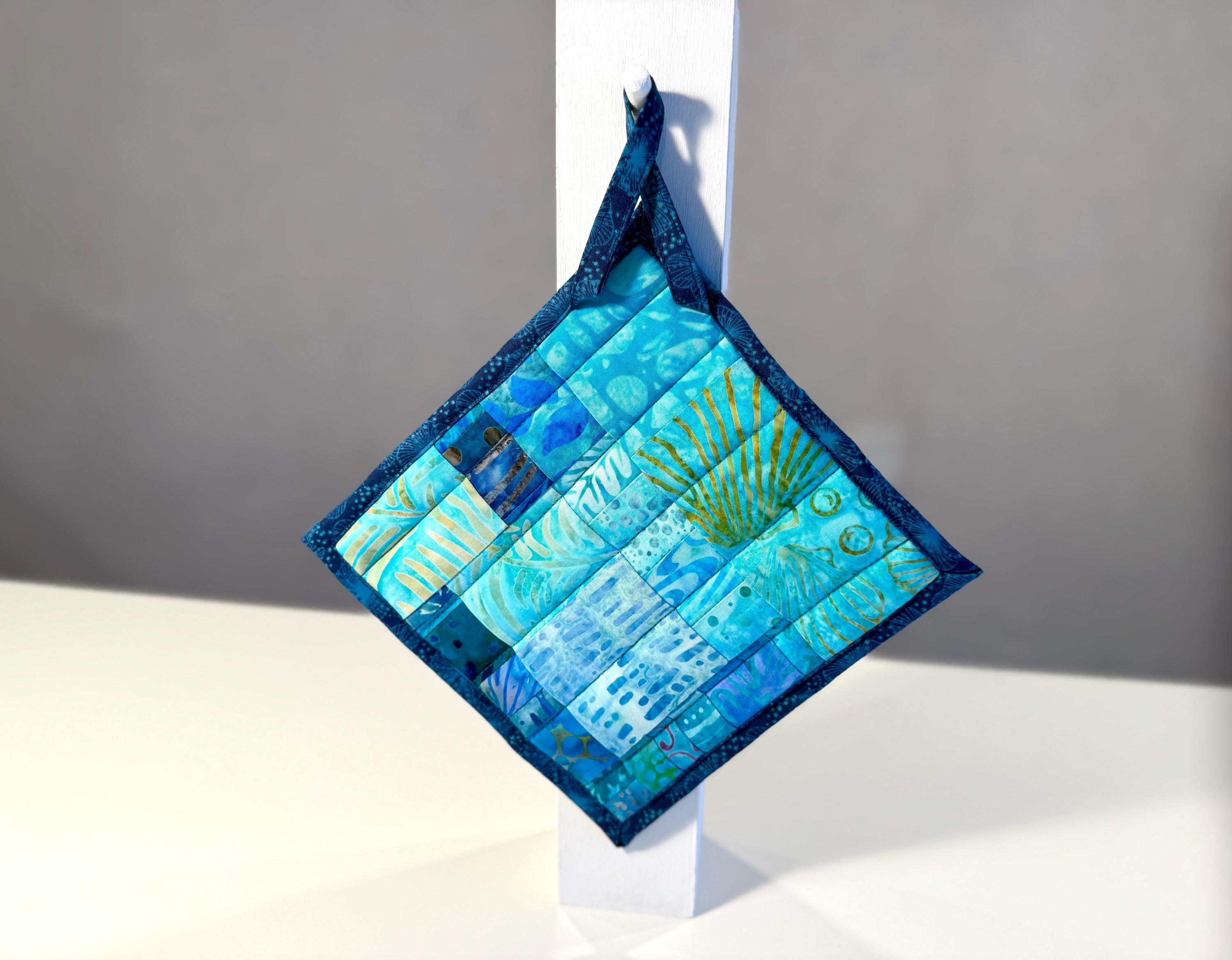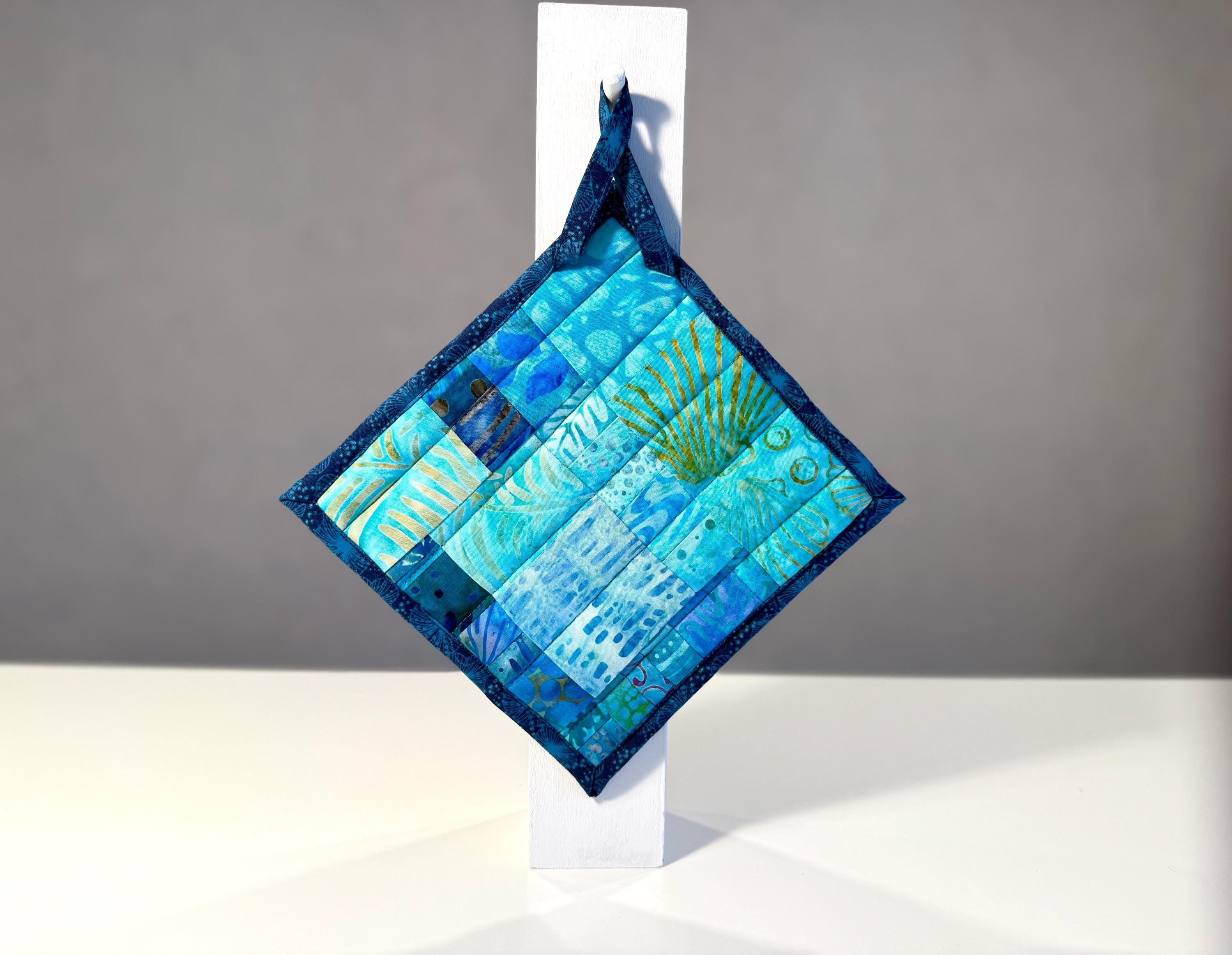 Handmade Quilted Pot holder in turquoise blues and greens, just like the ocean!