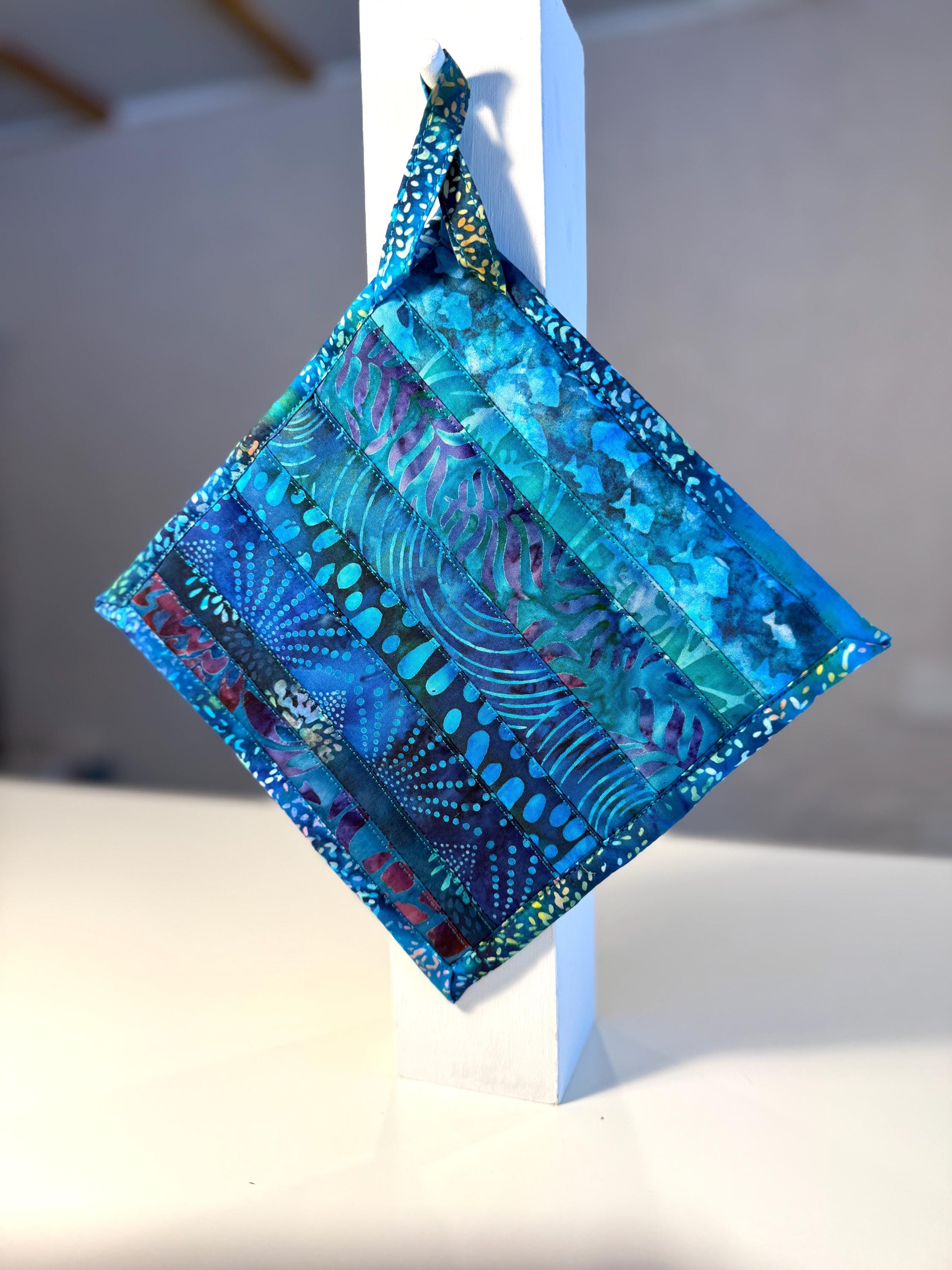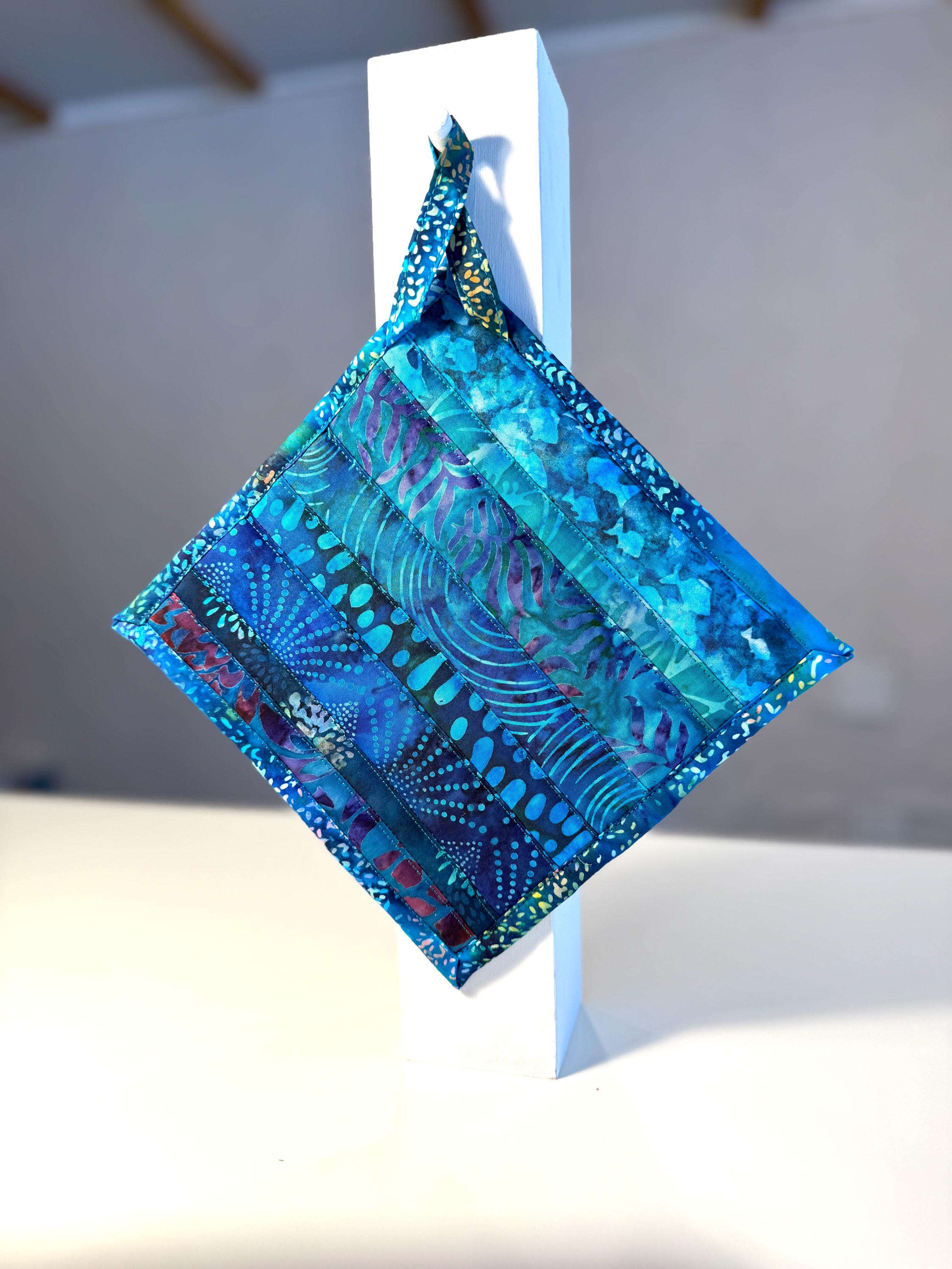 Handmade Quilted Pot holder in turquoise blues and greens, just like the ocean!